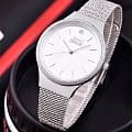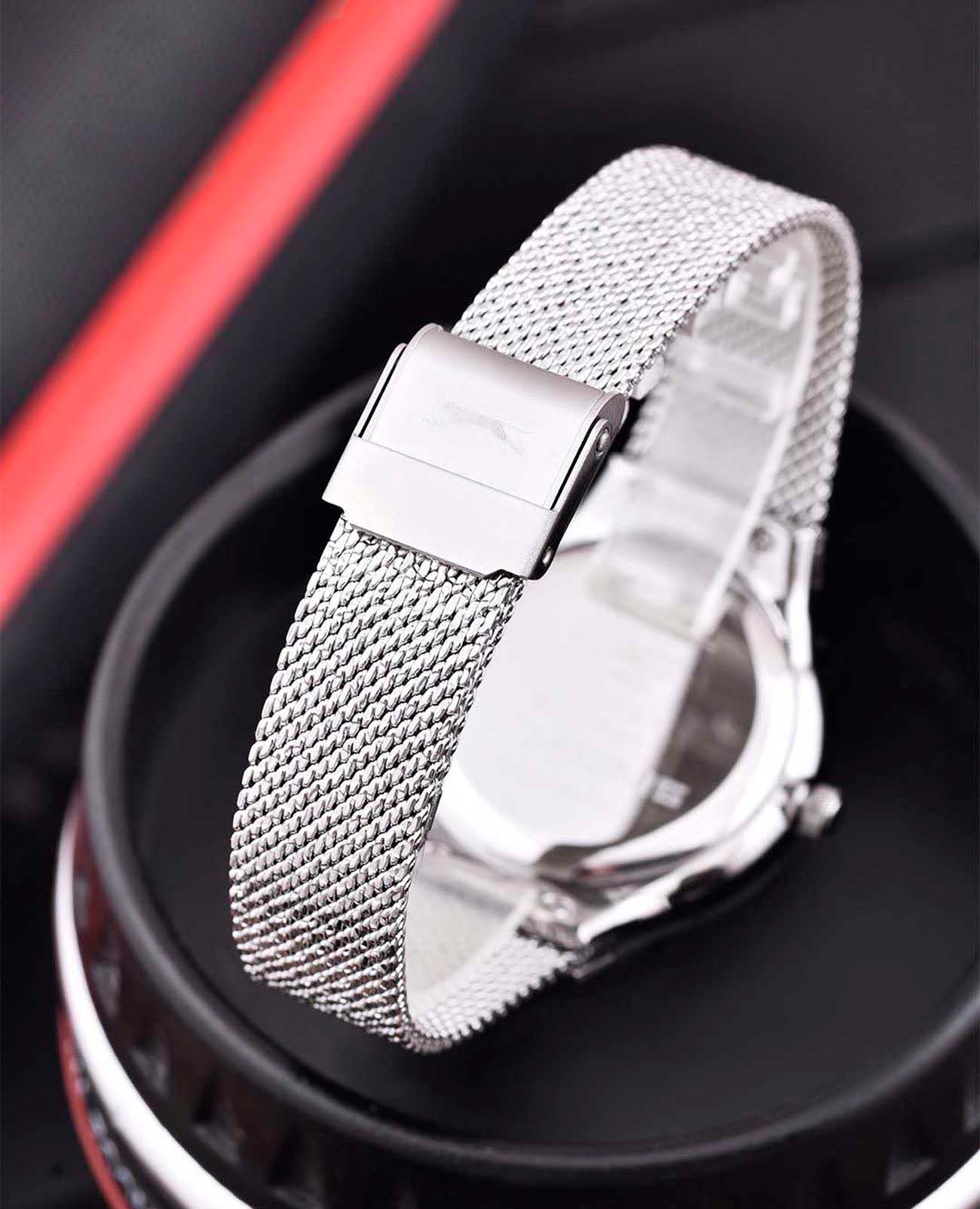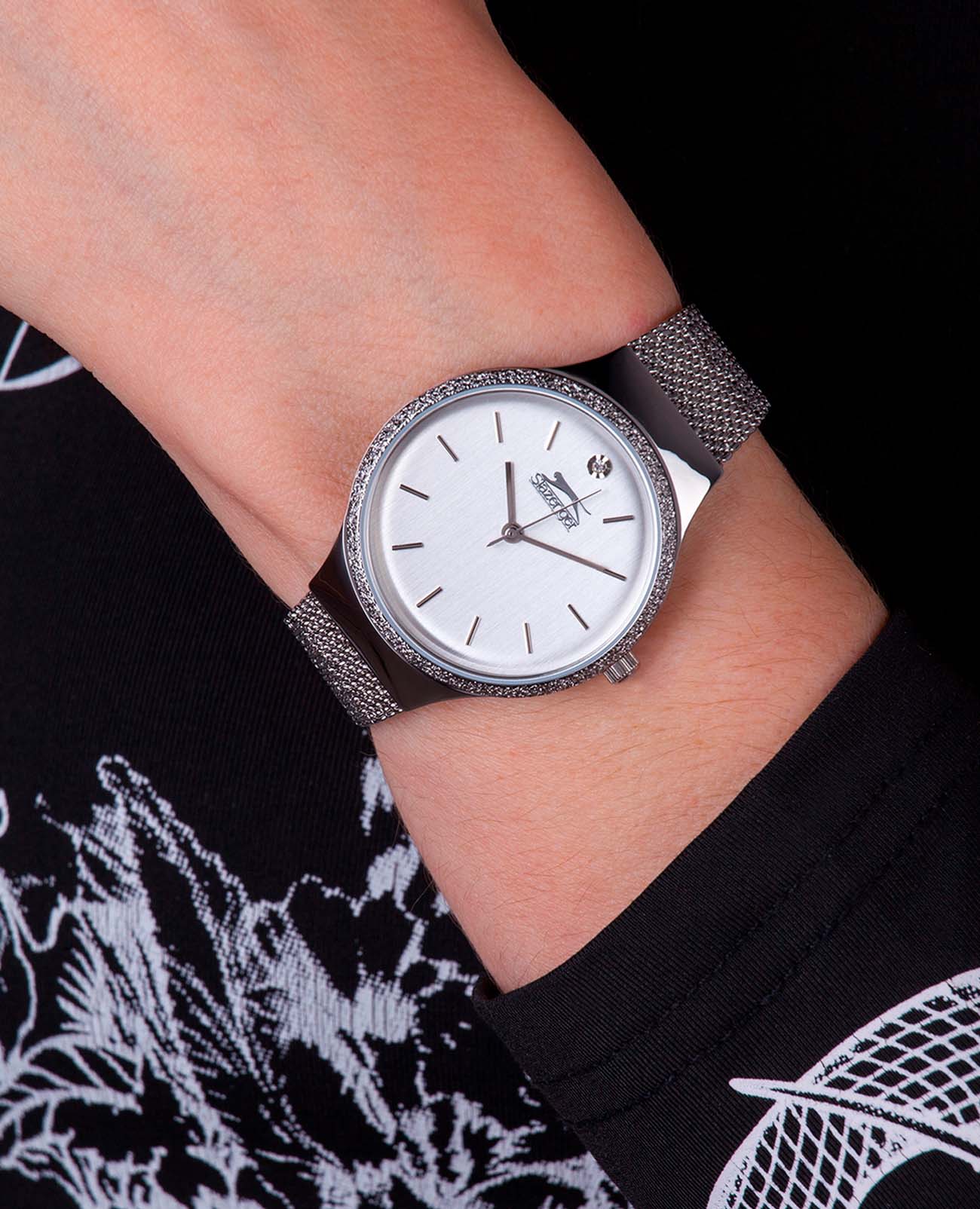 Женские наручные часы Slazenger SL.09.2015.3.01 сочетают в себе элегантный дизайн и практичность современных технологий. Модель обладает круглым корпусом диаметром 9 мм, изготовленным из суперметалла, что обеспечивает высокую устойчивость к внешним воздействиям. Браслет выполнен в технике миланского плетения из суперметалла на раскладном замкеРаскладной замокДанный вариант застежки используется только на часах с металлическим браслетом. Отличительная особенность такого крепления в том, что длина браслета становится универсальной и вы можете самостоятельно отрегулировать нужный вам размер – застежка просто двигается по браслету часов., гарантирующей комфортное ношение и безопасность. Циферблат белого цвета украшен фианитом, создавая благородный внешний вид. Для защиты используется минеральное стеклоМинеральное стеклоМинеральное стекло представляет собой искусственно выращенный минерал кварца. Такое стекло отличается особой устойчивостью к повреждениям и царапинам. Уступает по некоторым качествам сапфировому стеклу., обеспечивающее прочную защиту от царапин. Часы имеют уровень водозащиты до 5 атмосфер (50 метров), что позволяет использовать их при мытье рук и хождении под дождем, однако не рекомендуется для плавания или других водных видов спорта. Часы работают на японском кварцевом механизме, что гарантирует точное время без необходимости подзаводки. Модель оснащена тремя стрелками и не имеет функции отображения даты, делая ее идеальной для повседневного использования. Вес часов составляет 58 грамм, что делает их удобными для длительного ношения, а производитель предоставляет гарантию сроком 12 месяцев. SL.09.2015.3.01 — это стильный аксессуар, который отлично дополнит как классический, так и casual образ женщины.