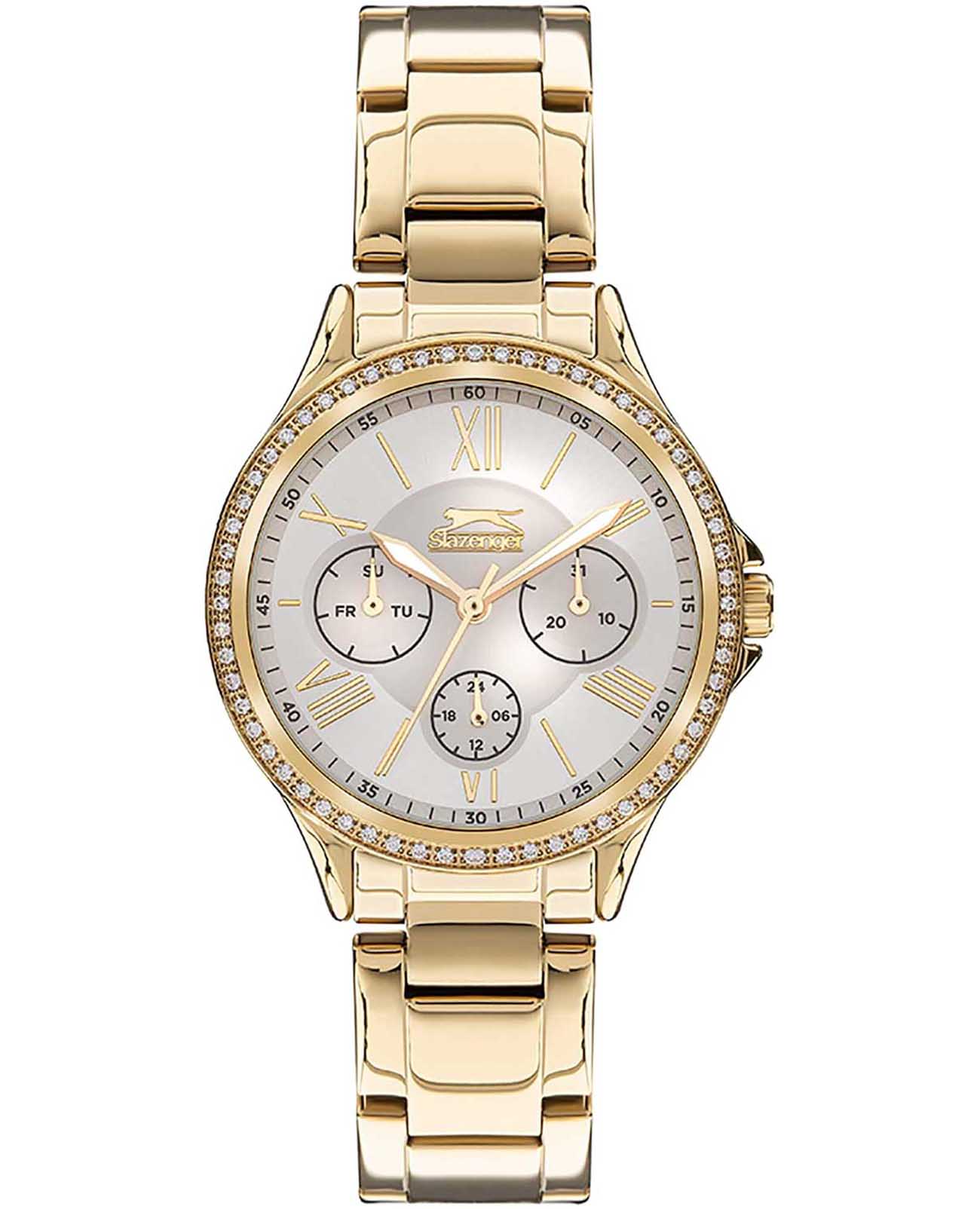 Slazenger SL.09.2021.4.02 – элегантные женские часы, сочетающие стильный дизайн и функциональность. Корпус выполнен из суперметалла с PVD-покрытиемPVDУльтратонкое покрытие наносится в технике вакуумного напыления, сочетает в себе нитрид титана особой прочности со слоем золота или оксида хрома. Несёт в себе декоративную или защитную функцию., придающим модели роскошный внешний вид. Перламутровый циферблат добавляет изысканности, и защищён минеральным стекломМинеральное стеклоМинеральное стекло представляет собой искусственно выращенный минерал кварца. Такое стекло отличается особой устойчивостью к повреждениям и царапинам. Уступает по некоторым качествам сапфировому стеклу., устойчивым к царапинам. БезельБезельВнешний ободок, закрепляющий стекло. В спортивных часах так называется поворотное кольцо с делениями на циферблате, выполняет роль таймера – замеряет отрезки времени на шкале. Неподвижный безель – элемент декора. Однонаправленно вращающийся безель на дайверских часах позволяет фиксировать моменты погружения и выныривания на поверхность. украшен кристаллами. Часы оснащены точным кварцевым механизмом, обеспечивающим надёжное и стабильное отображение времени. Дополнительные функции включают индикацию дня недели и даты, что повышает практичность использования. Браслет из суперметалла с PVD-покрытиемPVDУльтратонкое покрытие наносится в технике вакуумного напыления, сочетает в себе нитрид титана особой прочности со слоем золота или оксида хрома. Несёт в себе декоративную или защитную функцию. оснащён раскладной застёжкойРаскладная застёжкаТакой тип застёжки используется только на браслетах из металла. Она никогда не раскрывается полностью, происходит разделение на 2 и более частей. Раскладывающая застёжка снизит вероятность потери часов к минимуму., обеспечивающей комфортное ношение и надёжную фиксацию на запястье. Водозащита до 30 метров (3 ATM) защищает часы от случайных брызг и дождя, делая их подходящими для повседневного использования.