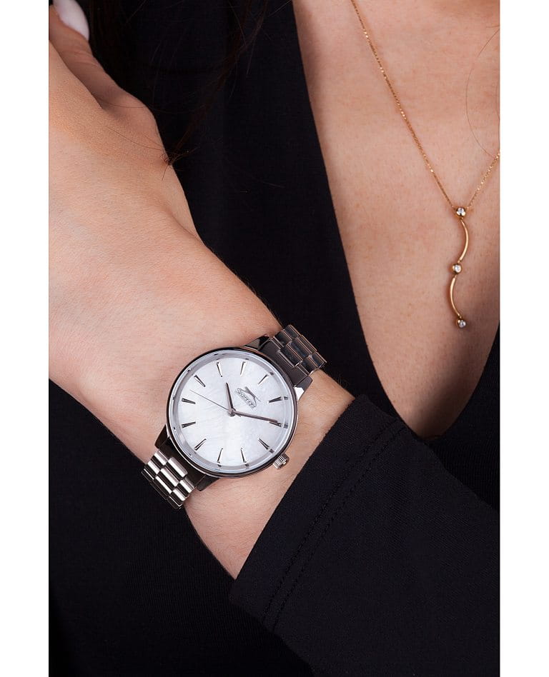 Часы Slazenger SL.09.2054.3.01 — это элегантное сочетание стиля и функциональности, созданное специально для женщин. Их изысканный серебристый циферблат и корпус из суперметалла придают часам современный и утонченный вид. Внутри скрыт надежный кварцевый механизм, который гарантирует точность и долговечность. Минеральное стеклоМинеральное стеклоМинеральное стекло представляет собой искусственно выращенный минерал кварца. Такое стекло отличается особой устойчивостью к повреждениям и царапинам. Уступает по некоторым качествам сапфировому стеклу. защищает часы от царапин. Браслет из суперметалла с раскладной застёжкойРаскладная застёжкаТакой тип застёжки используется только на браслетах из металла. Она никогда не раскрывается полностью, происходит разделение на 2 и более частей. Раскладывающая застёжка снизит вероятность потери часов к минимуму. подчеркивает женственность дизайна и обеспечивает комфорт в носке. Диаметр корпуса составляет 35 мм, а толщина — 9 мм, что делает их идеальным аксессуаром для любой стильной женщины. Водозащита уровня 3 ATM позволяет не беспокоиться о случайных брызгах.