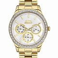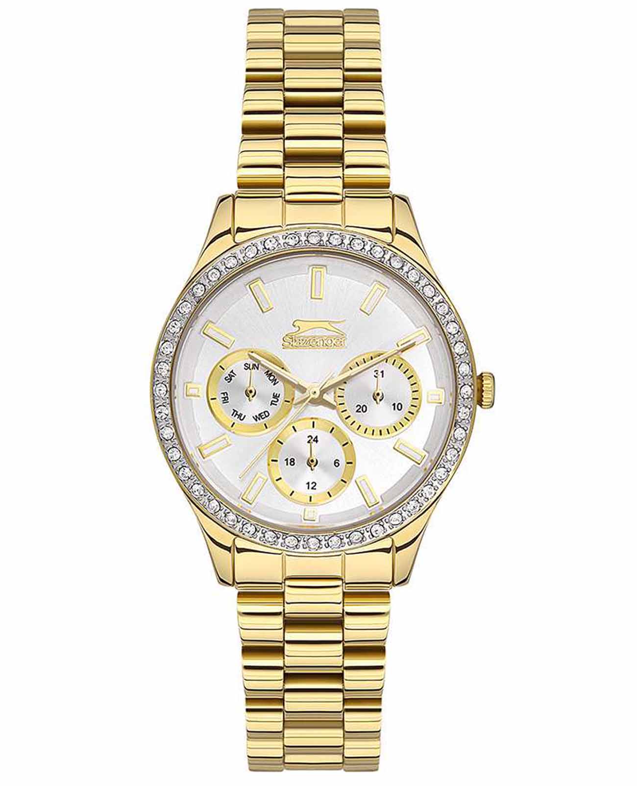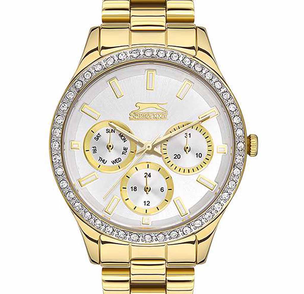 Женские наручные часы Slazenger SL.09.2069.4.05 сочетают в себе классический дизайн и высокое качество исполнения. Модель обладает круглым корпусом диаметром 34 мм, изготовленным из суперметалла IP-покрытиемIP-покрытиеМетод ионного напыления. Демонстрирует повышенную устойчивость к истиранию, окислению и химическим веществам. Под воздействием высокого давления и температуры около 1500°C молекулы металла надёжно соединяются с частицами корпуса часов. цвета желтого золота, что обеспечивает устойчивость к внешним воздействиям. Браслет выполнен из суперметалла с IP-покрытиемIP-покрытиеМетод ионного напыления. Демонстрирует повышенную устойчивость к истиранию, окислению и химическим веществам. Под воздействием высокого давления и температуры около 1500°C молекулы металла надёжно соединяются с частицами корпуса часов. на раскладной застёжкеРаскладная застёжкаТакой тип застёжки используется только на браслетах из металла. Она никогда не раскрывается полностью, происходит разделение на 2 и более частей. Раскладывающая застёжка снизит вероятность потери часов к минимуму.. Неподвижный безельБезельВнешний ободок, закрепляющий стекло. В спортивных часах так называется поворотное кольцо с делениями на циферблате, выполняет роль таймера – замеряет отрезки времени на шкале. Неподвижный безель – элемент декора. Однонаправленно вращающийся безель на дайверских часах позволяет фиксировать моменты погружения и выныривания на поверхность. украшен кристаллами. Перламутровый циферблат оформлен логотипом бренда и метками времени. Имеются дополнительные малые циферблаты для отображения даты, дня недели и текущего времени в 24-часовом формате. Для защиты используется минеральное стеклоМинеральное стеклоМинеральное стекло представляет собой искусственно выращенный минерал кварца. Такое стекло отличается особой устойчивостью к повреждениям и царапинам. Уступает по некоторым качествам сапфировому стеклу., обеспечивающее прочную защиту от царапин. Стрелки и метки имеют люминесцентное покрытиеЛюминесцентное покрытиеПозволяет считывать показания времени в темноте. Производители наносят на стрелки, часовые индексы, безель или поверхность циферблата светонакопительный состав, дающий холодное свечение., что позволяет легко читать время в темноте. Часы работают на японском кварцевом механизме, который обеспечивает точность хода без необходимости подзаводки. Водонепроницаемость часов составляет 3 атмосферы (WR30), что позволяет защитить корпус от случайных брызг или капель дождя.
