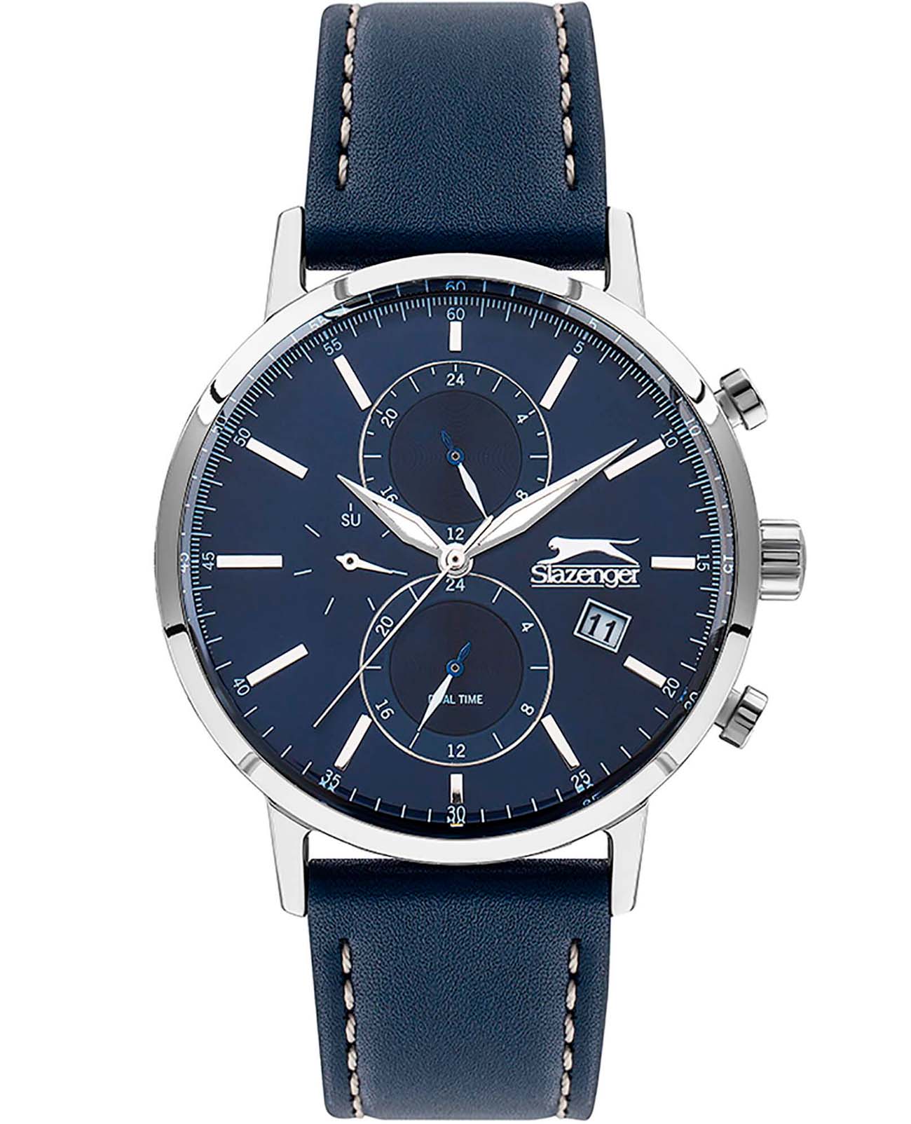 Мужские наручные часы с минеральным стекломМинеральное стеклоМинеральное стекло представляет собой искусственно выращенный минерал кварца. Такое стекло отличается особой устойчивостью к повреждениям и царапинам. Уступает по некоторым качествам сапфировому стеклу. Slazenger SL.09.2076.2.03 сочетают в себе классический дизайн и функциональность современных технологий. Модель обладает круглым корпусом диаметром 44 мм, изготовленным из суперметалла, что обеспечивает высокую устойчивость к внешним воздействиям. Браслет выполнен из кожи с классической застежкой, гарантирующей комфортное ношение и безопасность. Циферблат оснащен окнами для отображения второго часового пояса, дня недели и текущего времени в 24-х часовом формате.Стрелки с люминесцентным покрытиемЛюминесцентное покрытиеПозволяет считывать показания времени в темноте. Производители наносят на стрелки, часовые индексы, безель или поверхность циферблата светонакопительный состав, дающий холодное свечение.. Часы работают на кварцевом механизме, что гарантирует точное время без необходимости подзаводки. Модель также имеет класс водонепроницаемости WR50 (5 атм), что позволяет использовать их во время плавания без ныряния.