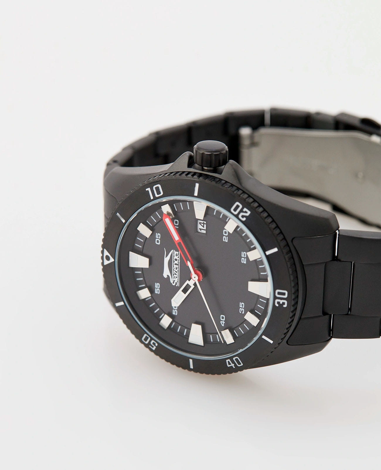 Мужские наручные часы Slazenger SL.09.2114.2.05 сочетают в себе классический дизайн и надежность современных технологий. Модель обладает круглым корпусом диаметром 44 мм, изготовленным из суперметалла с IP-покрытиемIP-покрытиеМетод ионного напыления. Демонстрирует повышенную устойчивость к истиранию, окислению и химическим веществам. Под воздействием высокого давления и температуры около 1500°C молекулы металла надёжно соединяются с частицами корпуса часов., что обеспечивает высокую устойчивость к внешним воздействиям. Браслет выполнен из того же материала с раскладной застежкойРаскладная застёжкаТакой тип застёжки используется только на браслетах из металла. Она никогда не раскрывается полностью, происходит разделение на 2 и более частей. Раскладывающая застёжка снизит вероятность потери часов к минимуму., гарантирующей комфортное ношение и безопасность. Чёрный циферблат оснащен индикатором даты. Для защиты применяется минеральное стеклоМинеральное стеклоМинеральное стекло представляет собой искусственно выращенный минерал кварца. Такое стекло отличается особой устойчивостью к повреждениям и царапинам. Уступает по некоторым качествам сапфировому стеклу., устойчивое к царапинам. Часы работают на кварцевом механизме, что гарантирует точное время без необходимости подзаводки. Водонепроницаемость часов достигает 5 атмосфер (50 метров), что позволяет использовать их при контакте с водой, например, во время мытья рук или попадания брызг, однако не рекомендуется для плавания. Вес часов составляет 162 грамма, что делает их удобными для ежедневного использования.