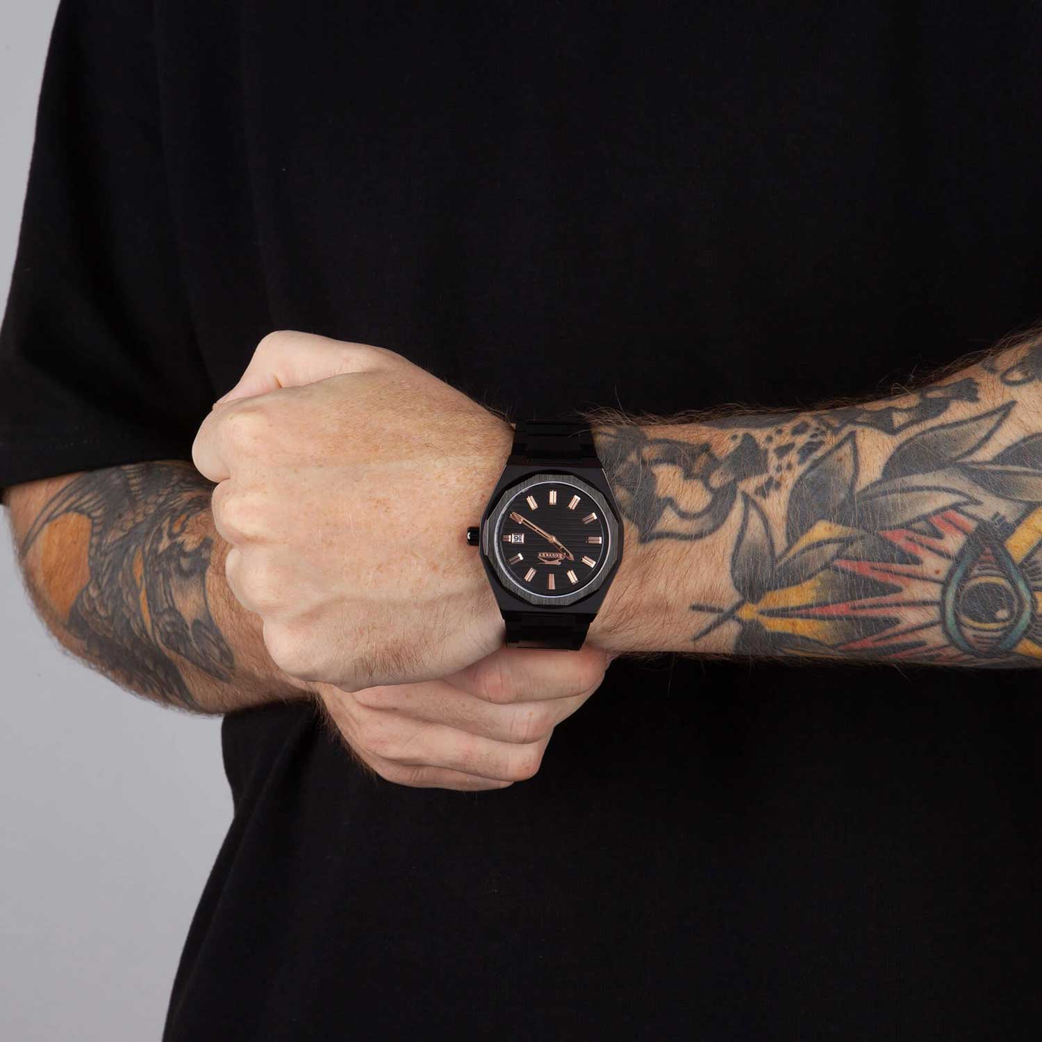 Часы Slazenger SL.09.2143.1.02 воплощают в себе элегантность и практичность, идеально подходящие для современных мужчин. Их черный циферблат защищен минеральным стекломМинеральное стеклоМинеральное стекло представляет собой искусственно выращенный минерал кварца. Такое стекло отличается особой устойчивостью к повреждениям и царапинам. Уступает по некоторым качествам сапфировому стеклу. и заключен в черный матовый корпус диаметром 41,5 мм, который изготовлен из прочного суперметалла с IP-покрытиемIP-покрытиеМетод ионного напыления. Демонстрирует повышенную устойчивость к истиранию, окислению и химическим веществам. Под воздействием высокого давления и температуры около 1500°C молекулы металла надёжно соединяются с частицами корпуса часов.. Окошко даты расположено в положении 3 часов. Надежный кварцевый механизм обеспечивает точность, а водозащита 5 ATM делает их устойчивыми к воздействию воды. Браслет из суперметалла с IP-покрытиемIP-покрытиеМетод ионного напыления. Демонстрирует повышенную устойчивость к истиранию, окислению и химическим веществам. Под воздействием высокого давления и температуры около 1500°C молекулы металла надёжно соединяются с частицами корпуса часов.  имеет раскладную застёжкуРаскладная застёжкаТакой тип застёжки используется только на браслетах из металла. Она никогда не раскрывается полностью, происходит разделение на 2 и более частей. Раскладывающая застёжка снизит вероятность потери часов к минимуму., что подчеркивает современный стиль и позволяет легко снимать часы. Ширина браслета 22-26 мм.