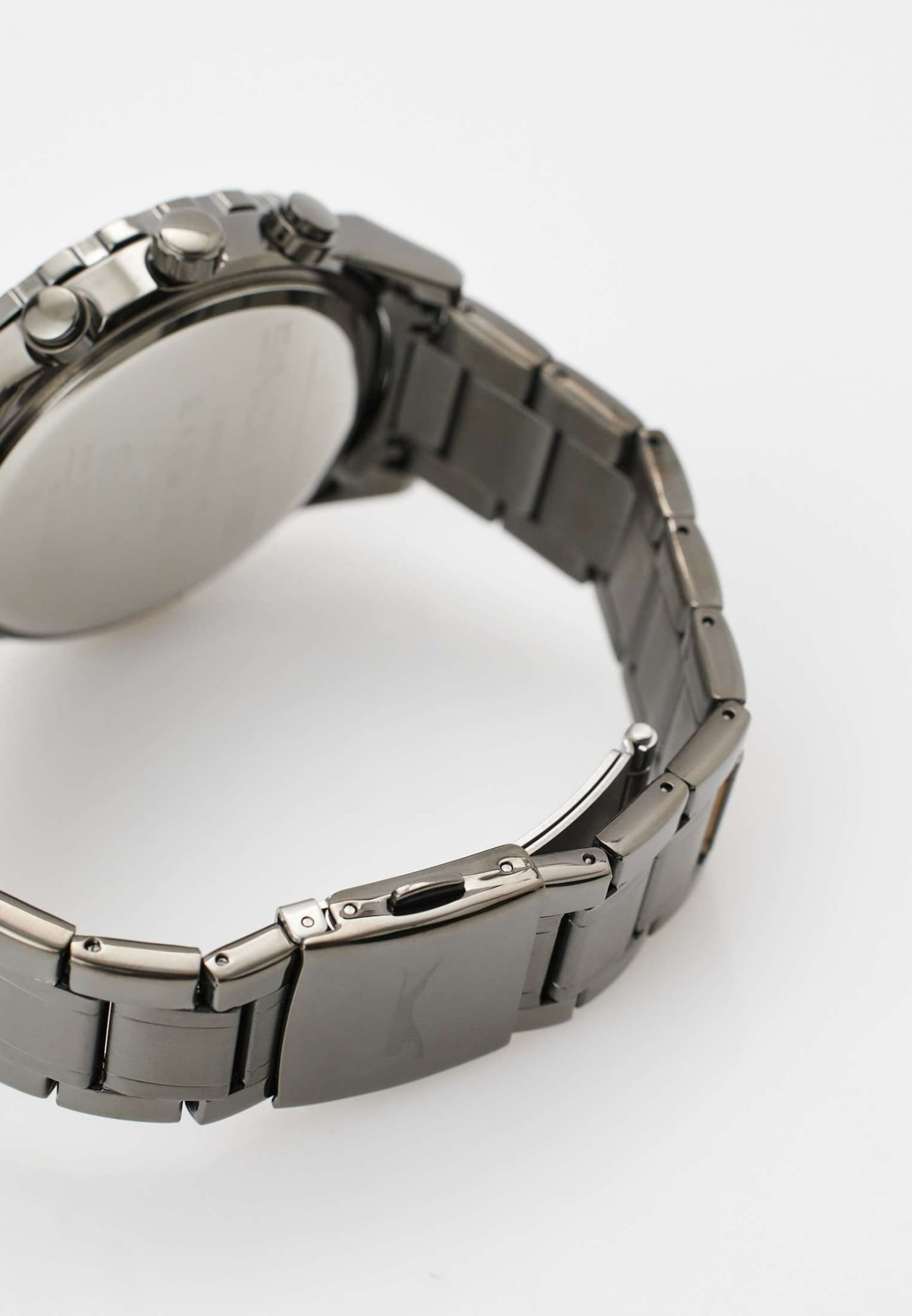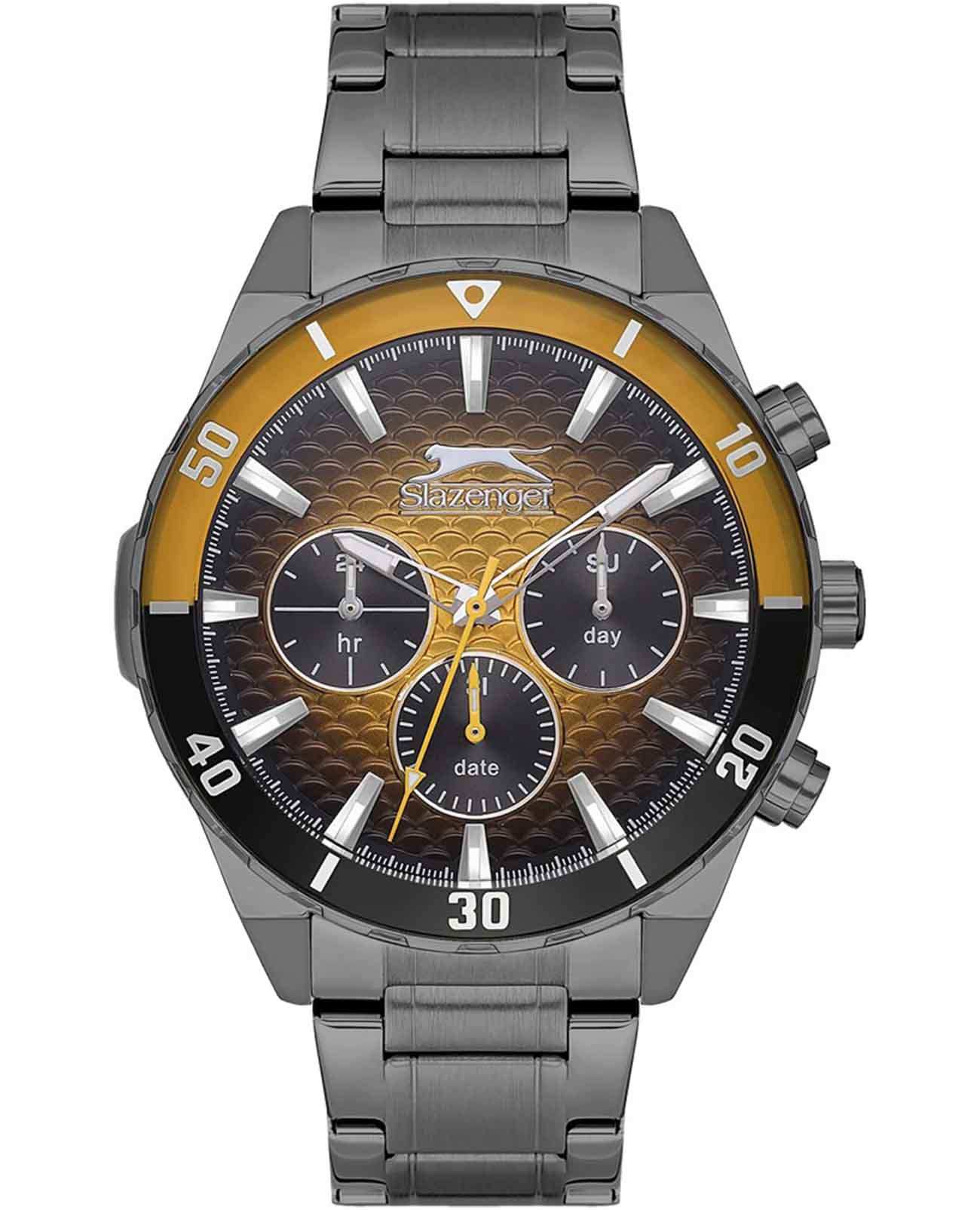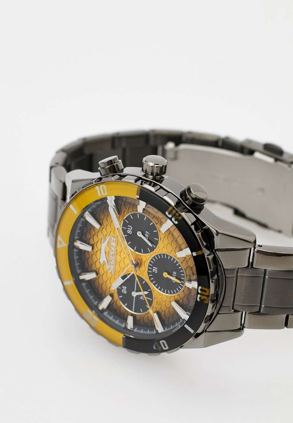 Часы Slazenger SL.09.2236.2.02 — это стильная и надежная модель, которая станет отличным выбором для активного современного мужчины. Крупный корпус диаметром 46 мм и браслет с раскладной застёжкойРаскладная застёжкаТакой тип застёжки используется только на браслетах из металла. Она никогда не раскрывается полностью, происходит разделение на 2 и более частей. Раскладывающая застёжка снизит вероятность потери часов к минимуму. с черным IP-покрытиемIP-покрытиеМетод ионного напыления. Демонстрирует повышенную устойчивость к истиранию, окислению и химическим веществам. Под воздействием высокого давления и температуры около 1500°C молекулы металла надёжно соединяются с частицами корпуса часов. выполнены из прочного металла, что обеспечивает комфорт и долговечность. На безельБезельВнешний ободок, закрепляющий стекло. В спортивных часах так называется поворотное кольцо с делениями на циферблате, выполняет роль таймера – замеряет отрезки времени на шкале. Неподвижный безель – элемент декора. Однонаправленно вращающийся безель на дайверских часах позволяет фиксировать моменты погружения и выныривания на поверхность. нанесено черное и желтое IP-покрытиеIP-покрытиеМетод ионного напыления. Демонстрирует повышенную устойчивость к истиранию, окислению и химическим веществам. Под воздействием высокого давления и температуры около 1500°C молекулы металла надёжно соединяются с частицами корпуса часов.. Минеральное стеклоМинеральное стеклоМинеральное стекло представляет собой искусственно выращенный минерал кварца. Такое стекло отличается особой устойчивостью к повреждениям и царапинам. Уступает по некоторым качествам сапфировому стеклу. защищает текстурированный черно-желтый циферблат с градиентом от случайных царапин, а водозащита уровня WR 50 позволяет не переживать о попадании влаги при контакте с водой. На циферблате расположены дополнительные малые циферблаты с отображением даты, дня недели и времени в 24-часовом формате, что делает использование часов максимально функциональным. Для удобства использования в темное время суток предусмотрено люминесцентное покрытиеЛюминесцентное покрытиеПозволяет считывать показания времени в темноте. Производители наносят на стрелки, часовые индексы, безель или поверхность циферблата светонакопительный состав, дающий холодное свечение. стрелок. Толщина корпуса составляет 13 мм, вес часов — 152 грамма.