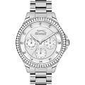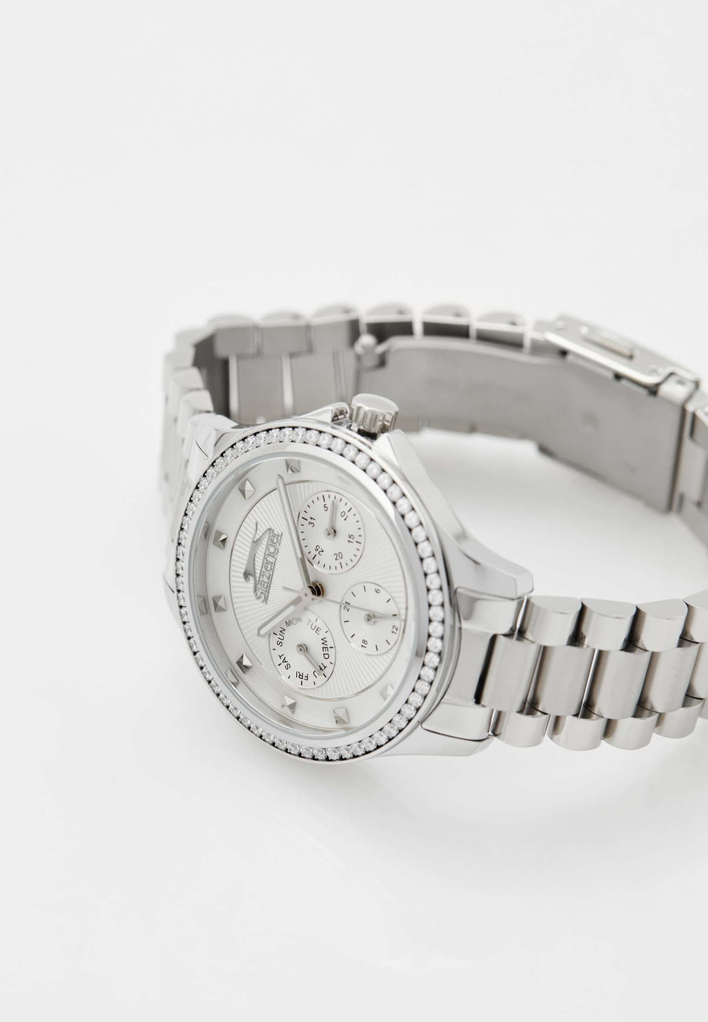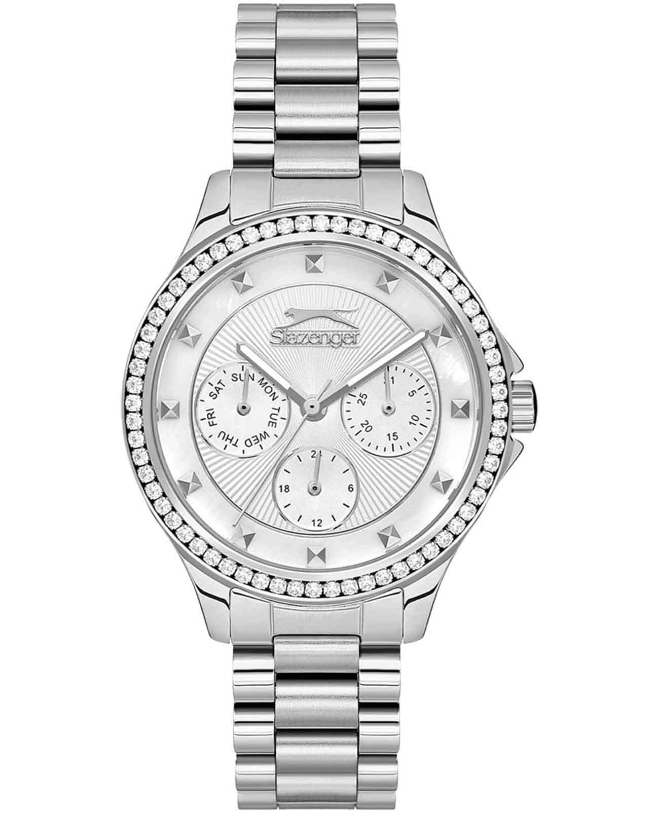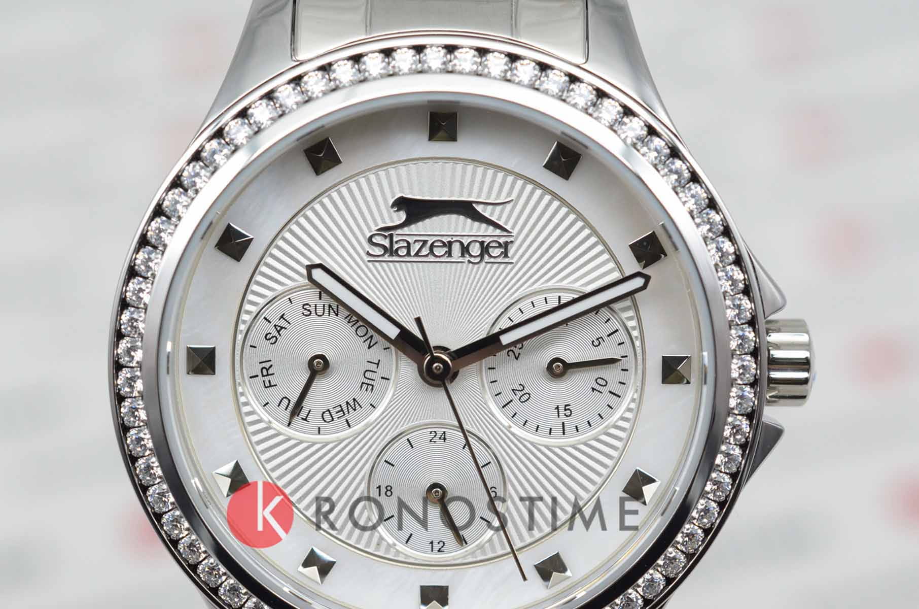 Эти женские часы Slazenger SL.09.2241.4.01 выполнены в современном стиле и станет элегантным дополнением к любому образу. Корпус и браслет изготовлены из прочного металла серебристого цвета, безельБезельВнешний ободок, закрепляющий стекло. В спортивных часах так называется поворотное кольцо с делениями на циферблате, выполняет роль таймера – замеряет отрезки времени на шкале. Неподвижный безель – элемент декора. Однонаправленно вращающийся безель на дайверских часах позволяет фиксировать моменты погружения и выныривания на поверхность. украшен изящными кристаллами, которые придают часам особую привлекательность. На циферблате расположены дополнительные малые циферблаты для отображения даты, дня недели и времени в 24-часовом формате, что делает их функциональными и удобными для ежедневного использования. Минеральное стеклоМинеральное стеклоМинеральное стекло представляет собой искусственно выращенный минерал кварца. Такое стекло отличается особой устойчивостью к повреждениям и царапинам. Уступает по некоторым качествам сапфировому стеклу. надежно защищает циферблат от царапин, а водозащита уровня WR 30 предохраняет механизм от случайных брызг воды. Заводная головка оснащена защитой, а стрелки имеют подсветку для легкого считывания времени в темноте. Диаметр корпуса составляет 34 мм, ширина браслета — 16 мм, толщина корпуса — 9 мм. Часы фиксируются на руке с помощью удобной раскладной застёжкиРаскладная застёжкаТакой тип застёжки используется только на браслетах из металла. Она никогда не раскрывается полностью, происходит разделение на 2 и более частей. Раскладывающая застёжка снизит вероятность потери часов к минимуму.. Вес изделия подобран для комфортной ежедневной носки. Для удобства использования в темное время суток предусмотрено люминесцентное покрытиеЛюминесцентное покрытиеПозволяет считывать показания времени в темноте. Производители наносят на стрелки, часовые индексы, безель или поверхность циферблата светонакопительный состав, дающий холодное свечение. стрелок.