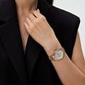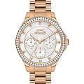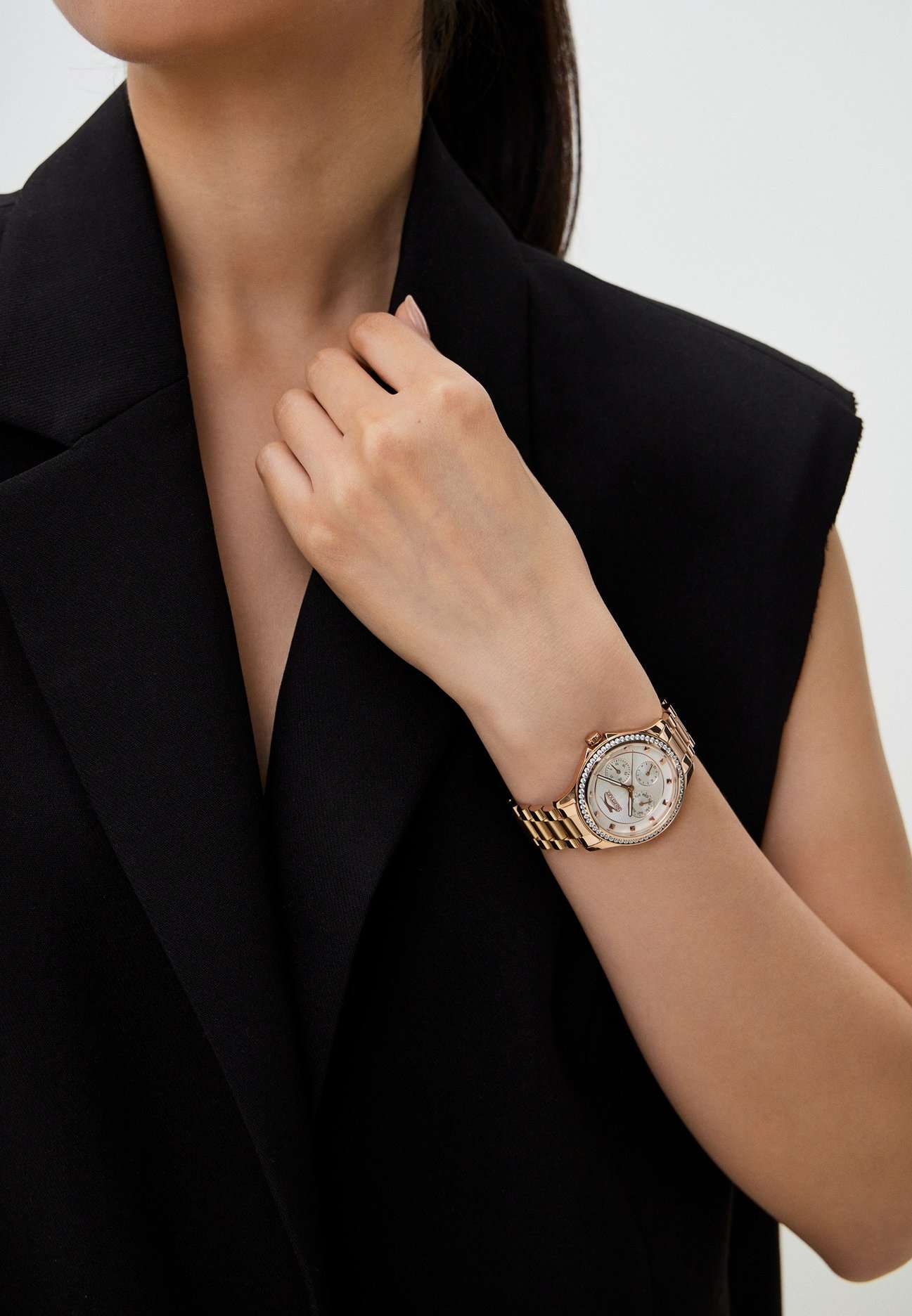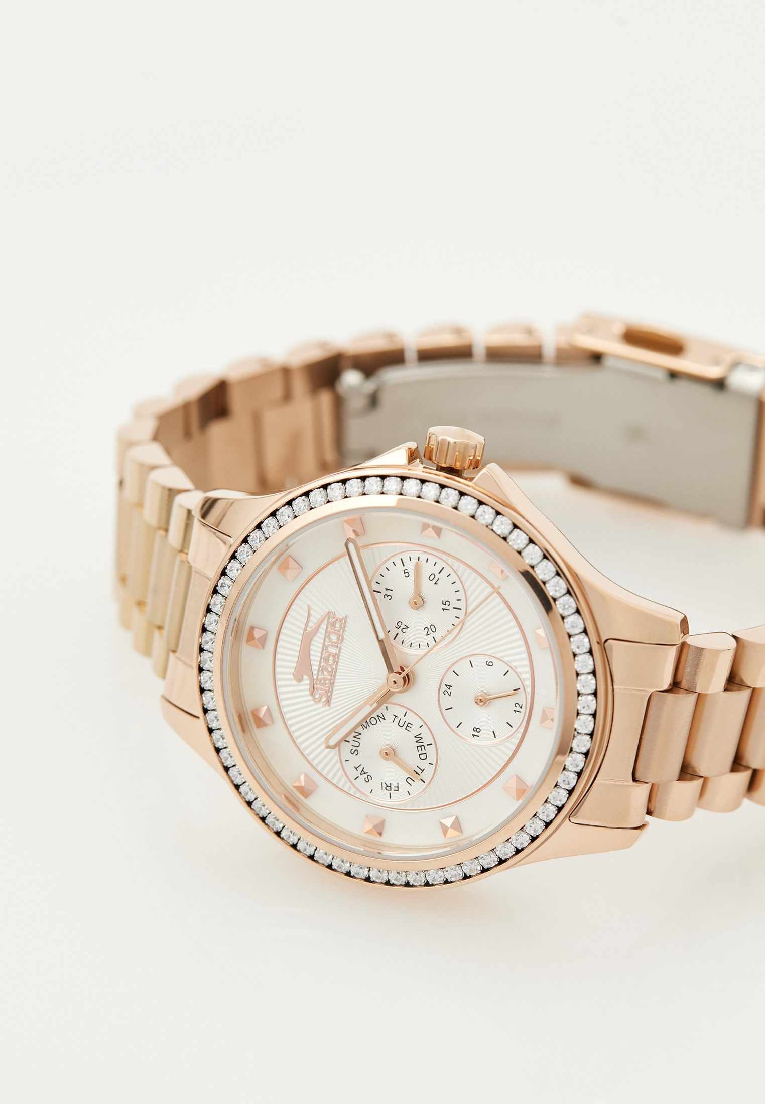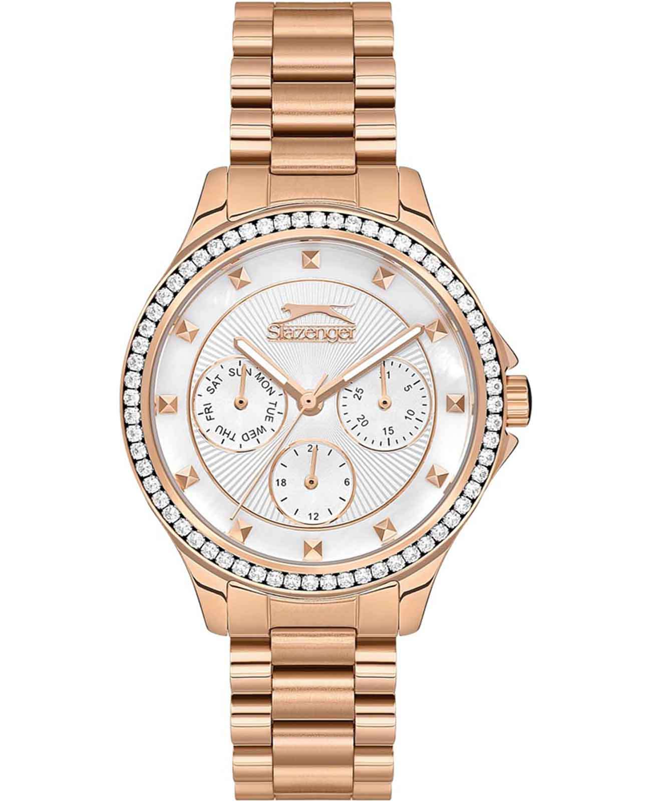 Эти женские часы Slazenger SL.09.2241.4.04 выполнены в современном стиле и станет элегантным дополнением к любому образу. Корпус и браслет изготовлены из прочного металла розово-золотистого цвета с IP-покрытиемIP-покрытиеМетод ионного напыления. Демонстрирует повышенную устойчивость к истиранию, окислению и химическим веществам. Под воздействием высокого давления и температуры около 1500°C молекулы металла надёжно соединяются с частицами корпуса часов., безельБезельВнешний ободок, закрепляющий стекло. В спортивных часах так называется поворотное кольцо с делениями на циферблате, выполняет роль таймера – замеряет отрезки времени на шкале. Неподвижный безель – элемент декора. Однонаправленно вращающийся безель на дайверских часах позволяет фиксировать моменты погружения и выныривания на поверхность. украшен изящными кристаллами, которые придают часам особую привлекательность. На циферблате расположены дополнительные малые циферблаты для отображения даты, дня недели и времени в 24-часовом формате, что делает их функциональными и удобными для ежедневного использования. Минеральное стеклоМинеральное стеклоМинеральное стекло представляет собой искусственно выращенный минерал кварца. Такое стекло отличается особой устойчивостью к повреждениям и царапинам. Уступает по некоторым качествам сапфировому стеклу. надежно защищает циферблат от царапин, а водозащита уровня WR 30 предохраняет механизм от случайных брызг воды. Заводная головка оснащена защитой, а стрелки имеют подсветку для легкого считывания времени в темноте. Диаметр корпуса составляет 34 мм, ширина браслета — 16 мм, толщина корпуса — 9 мм. Часы фиксируются на руке с помощью удобной раскладной застёжкиРаскладная застёжкаТакой тип застёжки используется только на браслетах из металла. Она никогда не раскрывается полностью, происходит разделение на 2 и более частей. Раскладывающая застёжка снизит вероятность потери часов к минимуму.. Вес изделия подобран для комфортной ежедневной носки. Для удобства использования в темное время суток предусмотрено люминесцентное покрытиеЛюминесцентное покрытиеПозволяет считывать показания времени в темноте. Производители наносят на стрелки, часовые индексы, безель или поверхность циферблата светонакопительный состав, дающий холодное свечение. стрелок.