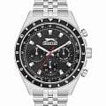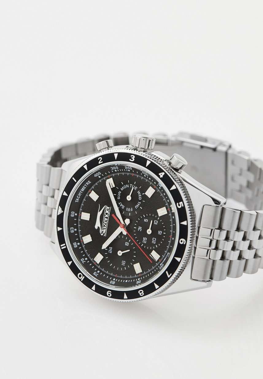 Часы Slazenger SL.09.2248.2.01 — это современная модель с выразительным спортивным характером, идеально подходящая для активного образа жизни. Корпус выполнен из прочного металла, черный циферблат защищён минеральным стекломМинеральное стеклоМинеральное стекло представляет собой искусственно выращенный минерал кварца. Такое стекло отличается особой устойчивостью к повреждениям и царапинам. Уступает по некоторым качествам сапфировому стеклу., устойчивым к царапинам. Часы также оснащены шкалой тахиметраТахиметрРазмеченная шкала, располагается на ободке или безеле часов. Тахиметр позволяет рассчитать скорость на определённом участке пути, расстояние измеряется в километрах или милях., что добавляет им функциональности и может быть полезно для измерения скорости.  На безельБезельВнешний ободок, закрепляющий стекло. В спортивных часах так называется поворотное кольцо с делениями на циферблате, выполняет роль таймера – замеряет отрезки времени на шкале. Неподвижный безель – элемент декора. Однонаправленно вращающийся безель на дайверских часах позволяет фиксировать моменты погружения и выныривания на поверхность. нанесено черное IP-покрытиеIP-покрытиеМетод ионного напыления. Демонстрирует повышенную устойчивость к истиранию, окислению и химическим веществам. Под воздействием высокого давления и температуры около 1500°C молекулы металла надёжно соединяются с частицами корпуса часов..  Диаметр корпуса составляет 46 мм, толщина — 11 мм, а ширина браслета — 22 мм.  Часы оснащены металлическим браслетом с надежной раскладной застёжкойРаскладная застёжкаТакой тип застёжки используется только на браслетах из металла. Она никогда не раскрывается полностью, происходит разделение на 2 и более частей. Раскладывающая застёжка снизит вероятность потери часов к минимуму., благодаря чему часы удобно сидят на руке и не вызывают дискомфорта даже при длительном ношении. Вес модели составляет 130 грамм. Надёжный кварцевый механизм обеспечивает точность времени, а уровень водозащиты WR 50 позволяет использовать часы в повседневных условиях, не опасаясь случайных брызг или дождя. Для удобства использования в темное время суток предусмотрено люминесцентное покрытиеЛюминесцентное покрытиеПозволяет считывать показания времени в темноте. Производители наносят на стрелки, часовые индексы, безель или поверхность циферблата светонакопительный состав, дающий холодное свечение. стрелок и меток. Дополнительные малые циферблаты показывают дату, день недели и текущее время в 24-часовом формате, что делает использование часов ещё более удобным и функциональным.
