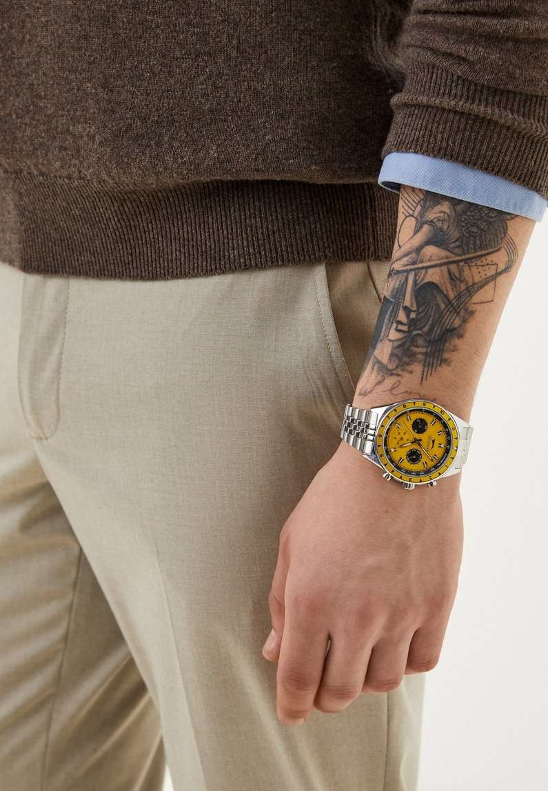 Часы Slazenger SL.09.2248.2.04 — это современная модель с выразительным спортивным характером, идеально подходящая для активного образа жизни. Корпус выполнен из прочного металла, желтый циферблат защищён минеральным стекломМинеральное стеклоМинеральное стекло представляет собой искусственно выращенный минерал кварца. Такое стекло отличается особой устойчивостью к повреждениям и царапинам. Уступает по некоторым качествам сапфировому стеклу., устойчивым к царапинам. Часы также оснащены шкалой тахиметраТахиметрРазмеченная шкала, располагается на ободке или безеле часов. Тахиметр позволяет рассчитать скорость на определённом участке пути, расстояние измеряется в километрах или милях., что добавляет им функциональности и может быть полезно для измерения скорости.  На безельБезельВнешний ободок, закрепляющий стекло. В спортивных часах так называется поворотное кольцо с делениями на циферблате, выполняет роль таймера – замеряет отрезки времени на шкале. Неподвижный безель – элемент декора. Однонаправленно вращающийся безель на дайверских часах позволяет фиксировать моменты погружения и выныривания на поверхность. нанесено желтое IP-покрытиеIP-покрытиеМетод ионного напыления. Демонстрирует повышенную устойчивость к истиранию, окислению и химическим веществам. Под воздействием высокого давления и температуры около 1500°C молекулы металла надёжно соединяются с частицами корпуса часов..  Диаметр корпуса составляет 46 мм, толщина — 11 мм, а ширина браслета — 22 мм.  Часы оснащены металлическим браслетом с надежной раскладной застёжкойРаскладная застёжкаТакой тип застёжки используется только на браслетах из металла. Она никогда не раскрывается полностью, происходит разделение на 2 и более частей. Раскладывающая застёжка снизит вероятность потери часов к минимуму., благодаря чему часы удобно сидят на руке и не вызывают дискомфорта даже при длительном ношении. Вес модели составляет 130 грамм. Надёжный кварцевый механизм обеспечивает точность времени, а уровень водозащиты WR 50 позволяет использовать часы в повседневных условиях, не опасаясь случайных брызг или дождя. Для удобства использования в темное время суток предусмотрено люминесцентное покрытиеЛюминесцентное покрытиеПозволяет считывать показания времени в темноте. Производители наносят на стрелки, часовые индексы, безель или поверхность циферблата светонакопительный состав, дающий холодное свечение. стрелок и меток. Дополнительные малые циферблаты показывают дату, день недели и текущее время в 24-часовом формате, что делает использование часов ещё более удобным и функциональным.