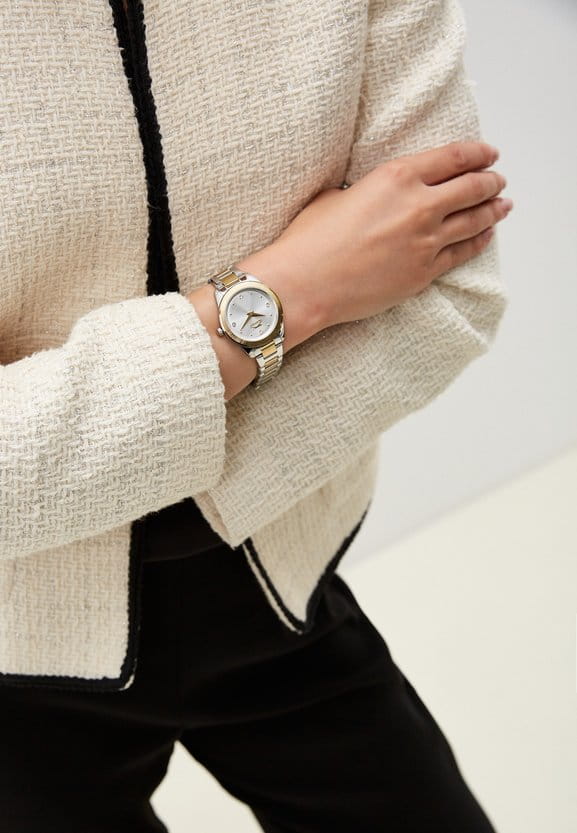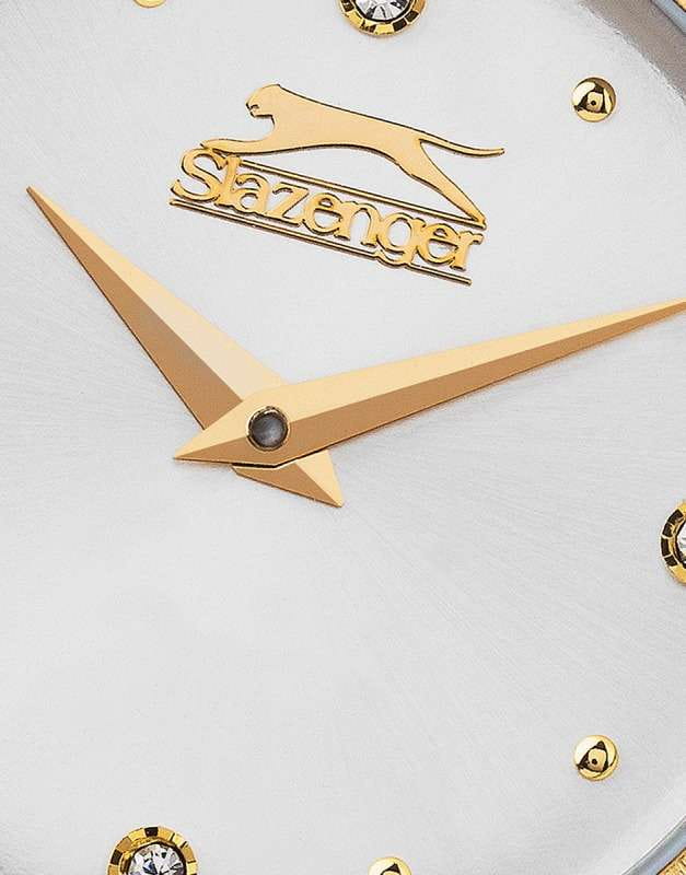 Часы Slazenger SL.09.2253.3.02 — это стильная и элегантная модель, созданная для тех, кто ценит утонченность и надежность. Корпус выполнен из прочного металла, а изящный серебристый браслет с частичным золотистым IP-покрытиемIP-покрытиеМетод ионного напыления. Демонстрирует повышенную устойчивость к истиранию, окислению и химическим веществам. Под воздействием высокого давления и температуры около 1500°C молекулы металла надёжно соединяются с частицами корпуса часов. оснащен удобной раскладной застёжкойРаскладная застёжкаТакой тип застёжки используется только на браслетах из металла. Она никогда не раскрывается полностью, происходит разделение на 2 и более частей. Раскладывающая застёжка снизит вероятность потери часов к минимуму.. На безельБезельВнешний ободок, закрепляющий стекло. В спортивных часах так называется поворотное кольцо с делениями на циферблате, выполняет роль таймера – замеряет отрезки времени на шкале. Неподвижный безель – элемент декора. Однонаправленно вращающийся безель на дайверских часах позволяет фиксировать моменты погружения и выныривания на поверхность. нанесено золотистое IP-покрытиеIP-покрытиеМетод ионного напыления. Демонстрирует повышенную устойчивость к истиранию, окислению и химическим веществам. Под воздействием высокого давления и температуры около 1500°C молекулы металла надёжно соединяются с частицами корпуса часов.. Минеральное стеклоМинеральное стеклоМинеральное стекло представляет собой искусственно выращенный минерал кварца. Такое стекло отличается особой устойчивостью к повреждениям и царапинам. Уступает по некоторым качествам сапфировому стеклу. защищает серебристый циферблат, украшенный сияющими кристаллами, придающими аксессуару особый шарм. Кварцевый механизм обеспечивает точность хода, а водозащита класса WR 30 позволяет не беспокоиться о случайных брызгах. Диаметр корпуса составляет 33 мм, ширина браслета — 16 мм, толщина корпуса — 8 мм, что делает эти часы аккуратными и комфортными для повседневной носки. Модель весит 70 грамм. Часы прекрасно дополнят как деловой, так и повседневный образ, подчеркивая индивидуальность своей обладательницы.