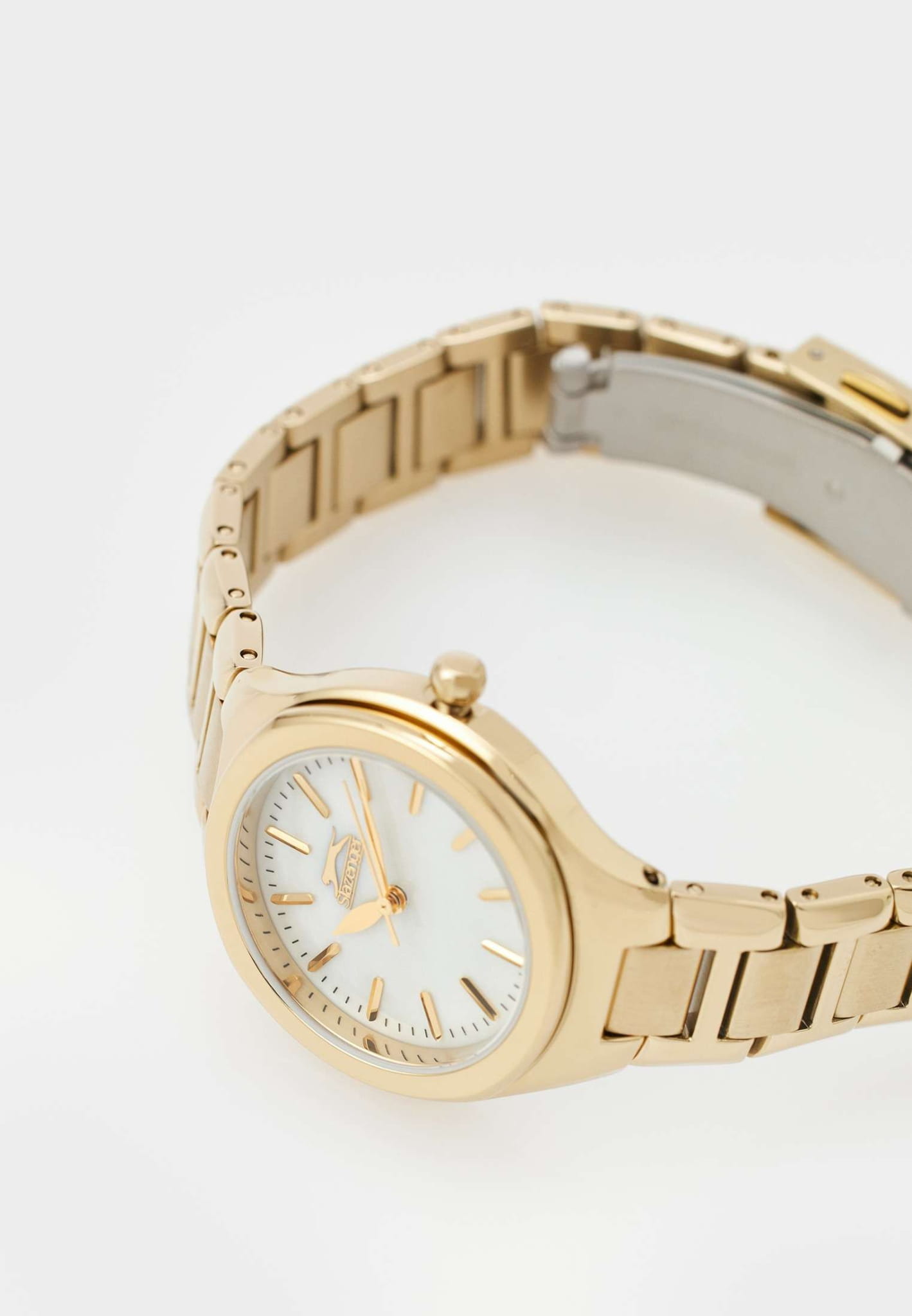 Часы Slazenger SL.09.2254.3.03 — это стильный и надежный аксессуар, который подчеркнет ваш индивидуальный образ. Корпус и браслет выполнены из инновационного суперметалла с изящным золотистым IP-покрытиемIP-покрытиеМетод ионного напыления. Демонстрирует повышенную устойчивость к истиранию, окислению и химическим веществам. Под воздействием высокого давления и температуры около 1500°C молекулы металла надёжно соединяются с частицами корпуса часов., обладающего особой прочностью и долговечностью благодаря специальной технологии покрытия. Модель оснащена точным кварцевым механизмом, который обеспечивает стабильную работу и не требует ежедневного завода. Под прочным минеральным стекломМинеральное стеклоМинеральное стекло представляет собой искусственно выращенный минерал кварца. Такое стекло отличается особой устойчивостью к повреждениям и царапинам. Уступает по некоторым качествам сапфировому стеклу. расположен лаконичный перламутровый циферблат, придающий часам элегантный и современный вид. Стальной браслет с раскладной застёжкойРаскладная застёжкаТакой тип застёжки используется только на браслетах из металла. Она никогда не раскрывается полностью, происходит разделение на 2 и более частей. Раскладывающая застёжка снизит вероятность потери часов к минимуму. обеспечивает комфортную посадку. Диаметр корпуса составляет 32 мм, толщина — 8 мм, что делает часы аккуратными и удобными для повседневного ношения. Класс водозащиты 3 атмосферы защищает механизм от случайных брызг и капель дождя.