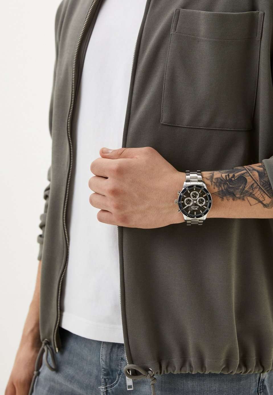 Часы Slazenger SL.09.2260.2.04 сочетают в себе выразительный дизайн и практичность, делая их отличным выбором для современного мужчины. Корпус и браслет выполнены из суперметалла — прочного сплава на основе меди с низким содержанием цинка и никеля, что обеспечивает долговечность изделия. На безельБезельВнешний ободок, закрепляющий стекло. В спортивных часах так называется поворотное кольцо с делениями на циферблате, выполняет роль таймера – замеряет отрезки времени на шкале. Неподвижный безель – элемент декора. Однонаправленно вращающийся безель на дайверских часах позволяет фиксировать моменты погружения и выныривания на поверхность. нанесено черное IP-покрытиеIP-покрытиеМетод ионного напыления. Демонстрирует повышенную устойчивость к истиранию, окислению и химическим веществам. Под воздействием высокого давления и температуры около 1500°C молекулы металла надёжно соединяются с частицами корпуса часов., что придает аксессуару утончённый и универсальный внешний вид. Модель оснащена точным кварцевым механизмом, защищённым минеральным стекломМинеральное стеклоМинеральное стекло представляет собой искусственно выращенный минерал кварца. Такое стекло отличается особой устойчивостью к повреждениям и царапинам. Уступает по некоторым качествам сапфировому стеклу.. На черном циферблате размещены дополнительные индикаторы: 24-часовой формат времени, дата и день недели. Класс водозащиты 5 бар позволяет не беспокоиться о брызгах и дожде. Диаметр корпуса составляет 45 мм, толщина — 12 мм, что придаёт часам солидный и современный вид. Стрелки с люминесцентным покрытиемЛюминесцентное покрытиеПозволяет считывать показания времени в темноте. Производители наносят на стрелки, часовые индексы, безель или поверхность циферблата светонакопительный состав, дающий холодное свечение. удобно подсвечиваются в темноте после зарядки на свету. Стальной браслет с раскладной застёжкойРаскладная застёжкаТакой тип застёжки используется только на браслетах из металла. Она никогда не раскрывается полностью, происходит разделение на 2 и более частей. Раскладывающая застёжка снизит вероятность потери часов к минимуму. обеспечивает комфортную посадку. Модель станет надёжным спутником как на каждый день, так и для особых случаев, а также превосходно подойдёт в качестве подарка. Гарантия от производителя — 12 месяцев.
