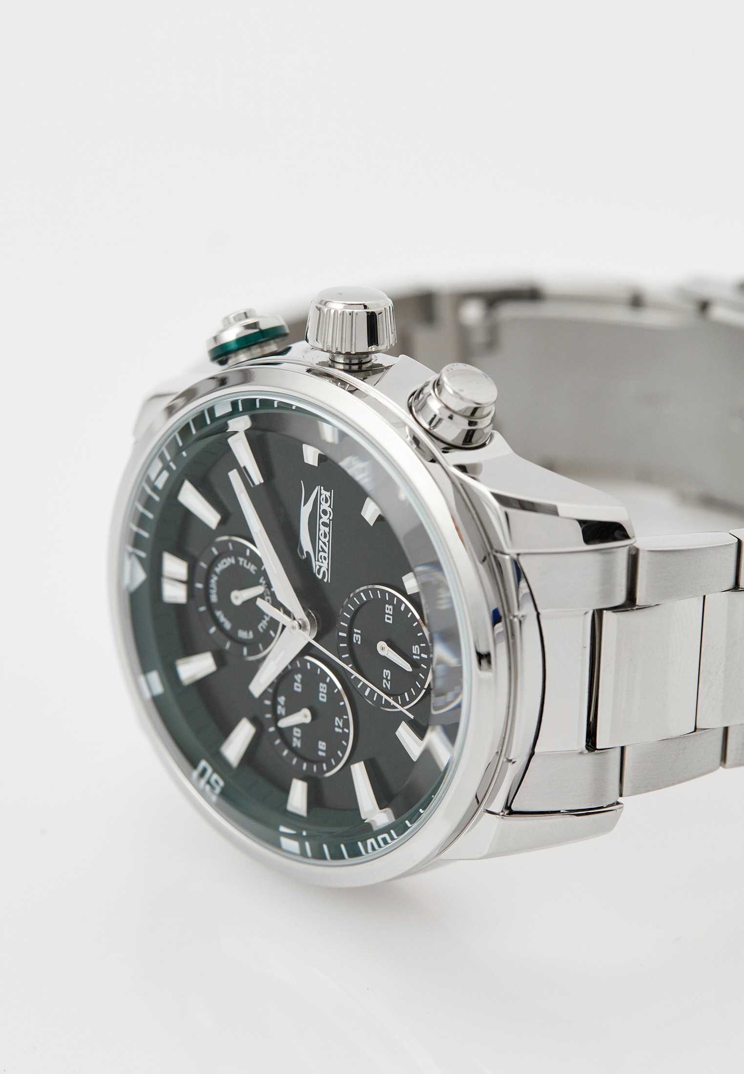 Часы Slazenger SL.09.2272.2.07 – это стильный аксессуар, сочетающий в себе современный дизайн и продуманную функциональность. Модель оснащена точным кварцевым механизмом, который гарантирует стабильную работу и легкость в использовании. Корпус и браслет выполнены из суперметалла — инновационного сплава на основе меди с пониженным содержанием цинка и никеля, обладающего высокой прочностью и устойчивостью к износу благодаря особой технологии покрытия. Элегантный зеленый циферблат защищён надёжным минеральным стекломМинеральное стеклоМинеральное стекло представляет собой искусственно выращенный минерал кварца. Такое стекло отличается особой устойчивостью к повреждениям и царапинам. Уступает по некоторым качествам сапфировому стеклу., устойчивым к царапинам и повреждениям. На циферблате размещены отдельные индикаторы: 24-часовой указатель времени, а также дополнительные циферблаты для отображения даты и дня недели, что делает модель максимально информативной и удобной в повседневном использовании. Водозащита 5 АТМ (5 бар) надёжно защищает механизм от брызг и дождя, а диаметр корпуса 45 мм и толщина 13 мм обеспечивают солидный внешний вид и комфортную посадку на запястье. Стальной браслет с раскладной застёжкойРаскладная застёжкаТакой тип застёжки используется только на браслетах из металла. Она никогда не раскрывается полностью, происходит разделение на 2 и более частей. Раскладывающая застёжка снизит вероятность потери часов к минимуму. обеспечивает комфортную посадку. Стрелки с люминесцентным покрытиемЛюминесцентное покрытиеПозволяет считывать показания времени в темноте. Производители наносят на стрелки, часовые индексы, безель или поверхность циферблата светонакопительный состав, дающий холодное свечение. удобно подсвечиваются в темноте после зарядки на свету. Часы подойдут как для ежедневного ношения, так и для особых случаев, а универсальный дизайн подчеркнёт индивидуальность и вкус владельца.