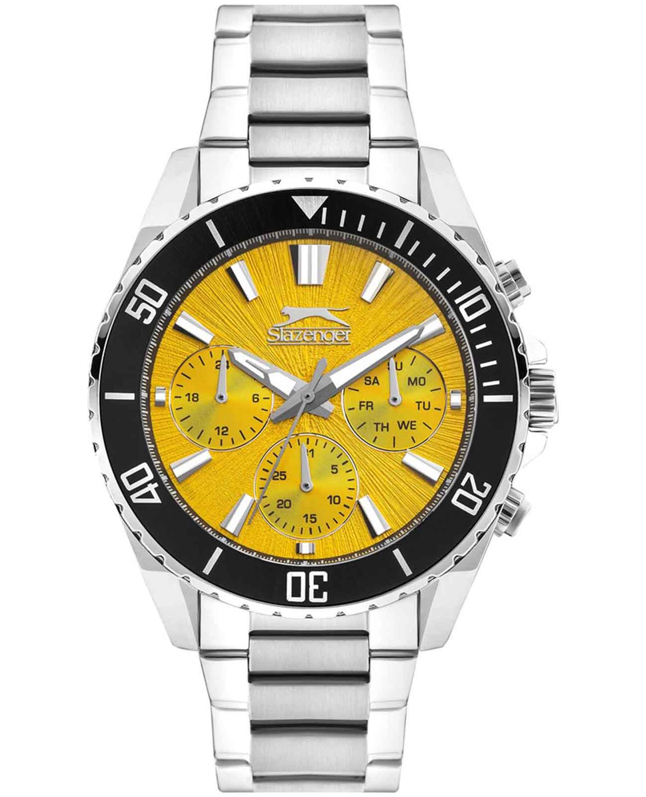 Часы Slazenger SL.09.2273.2.04 – стильный и функциональный аксессуар, который станет достойным дополнением к вашему образу. Модель оснащена надежным кварцевым механизмом, заключенным в корпус из инновационного суперметалла – прочного сплава на основе меди с пониженным содержанием цинка и никеля и специальным покрытием, устойчивым к износу. На безельБезельВнешний ободок, закрепляющий стекло. В спортивных часах так называется поворотное кольцо с делениями на циферблате, выполняет роль таймера – замеряет отрезки времени на шкале. Неподвижный безель – элемент декора. Однонаправленно вращающийся безель на дайверских часах позволяет фиксировать моменты погружения и выныривания на поверхность. нанесено черное IP-покрытиеIP-покрытиеМетод ионного напыления. Демонстрирует повышенную устойчивость к истиранию, окислению и химическим веществам. Под воздействием высокого давления и температуры около 1500°C молекулы металла надёжно соединяются с частицами корпуса часов., что придает аксессуару утончённый и универсальный внешний вид. Желтый циферблат под минеральным стекломМинеральное стеклоМинеральное стекло представляет собой искусственно выращенный минерал кварца. Такое стекло отличается особой устойчивостью к повреждениям и царапинам. Уступает по некоторым качествам сапфировому стеклу. дополнен отдельными счетчиками: 24-часовой указатель времени, индикаторы даты и дня недели. Диаметр корпуса составляет 44 мм, а толщина – 12 мм, что обеспечивает комфортную посадку на запястье и подчёркивает современный стиль часов. Браслет из суперметалла и с раскладной застёжкойРаскладная застёжкаТакой тип застёжки используется только на браслетах из металла. Она никогда не раскрывается полностью, происходит разделение на 2 и более частей. Раскладывающая застёжка снизит вероятность потери часов к минимуму. обеспечивает комфортную посадку. Стрелки и метки с люминесцентным покрытиемЛюминесцентное покрытиеПозволяет считывать показания времени в темноте. Производители наносят на стрелки, часовые индексы, безель или поверхность циферблата светонакопительный состав, дающий холодное свечение. удобно подсвечиваются в темноте после зарядки на свету. Водонепроницаемость 5 АТМ защищает механизм от брызг и дождя, позволяя не беспокоиться о сохранности аксессуара в повседневной жизни. Эта модель станет отличным выбором для ежедневного ношения или особых случаев и прекрасным подарком для мужчины к любому празднику.
