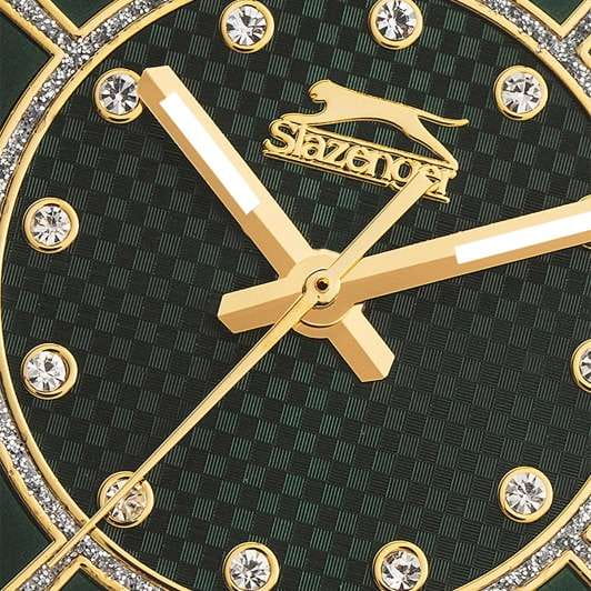 Женские наручные часы Slazenger SL.09.2295.3.02 — это элегантный аксессуар, который подчеркнет утончённый стиль своей обладательницы. Корпус диаметром 36 мм и толщиной 11,5 мм выполнен из прочного металла и надёжно защищён минеральным стекломМинеральное стеклоМинеральное стекло представляет собой искусственно выращенный минерал кварца. Такое стекло отличается особой устойчивостью к повреждениям и царапинам. Уступает по некоторым качествам сапфировому стеклу., устойчивым к царапинам. Зеленый циферблат украшен изящными кристаллами, придающими часам особый блеск и изысканность. Модель оснащена люминесцентным покрытиемЛюминесцентное покрытиеПозволяет считывать показания времени в темноте. Производители наносят на стрелки, часовые индексы, безель или поверхность циферблата светонакопительный состав, дающий холодное свечение. стрелок, что облегчает считывание времени в темноте. Особое внимание привлекает безельБезельВнешний ободок, закрепляющий стекло. В спортивных часах так называется поворотное кольцо с делениями на циферблате, выполняет роль таймера – замеряет отрезки времени на шкале. Неподвижный безель – элемент декора. Однонаправленно вращающийся безель на дайверских часах позволяет фиксировать моменты погружения и выныривания на поверхность. с черным IP-покрытиемIP-покрытиеМетод ионного напыления. Демонстрирует повышенную устойчивость к истиранию, окислению и химическим веществам. Под воздействием высокого давления и температуры около 1500°C молекулы металла надёжно соединяются с частицами корпуса часов.. Металлический браслет с частичным золотистым IP-покрытиемIP-покрытиеМетод ионного напыления. Демонстрирует повышенную устойчивость к истиранию, окислению и химическим веществам. Под воздействием высокого давления и температуры около 1500°C молекулы металла надёжно соединяются с частицами корпуса часов. шириной 16 мм оснащён удобной раскладной застёжкойРаскладная застёжкаТакой тип застёжки используется только на браслетах из металла. Она никогда не раскрывается полностью, происходит разделение на 2 и более частей. Раскладывающая застёжка снизит вероятность потери часов к минимуму. для комфортной посадки на запястье. Кварцевый механизм обеспечивает точность хода, а водозащита уровня WR 30 защищает часы от случайных брызг. Для удобства в условиях плохой освещённости предусмотрена подсветка стрелок. Вес изделия составляет 95 граммов.