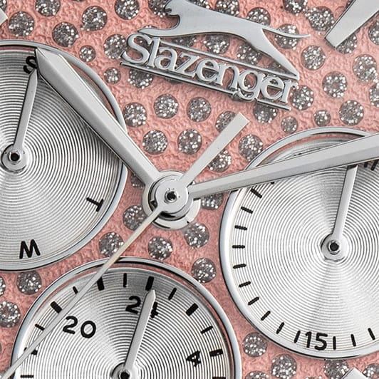 Женские кварцевые часы Slazenger SL.09.2299.3.01 — это элегантный и функциональный аксессуар, сочетающий стиль и надёжность. Корпус и браслет выполнены из суперметалла, защищён минеральным стекломМинеральное стеклоМинеральное стекло представляет собой искусственно выращенный минерал кварца. Такое стекло отличается особой устойчивостью к повреждениям и царапинам. Уступает по некоторым качествам сапфировому стеклу.. Циферблат розового цвета украшен фианитами, придающими модели изысканное сияние. Часы оснащены вынесенными малыми циферблатами для индикации дня недели, даты и времени в 24-часовом формате. Браслет фиксируется на раскладной застёжкеРаскладная застёжкаТакой тип застёжки используется только на браслетах из металла. Она никогда не раскрывается полностью, происходит разделение на 2 и более частей. Раскладывающая застёжка снизит вероятность потери часов к минимуму., обеспечивая удобство и надёжность ношения. Водонепроницаемость 30 м позволяет использовать часы в повседневных условиях, защищая от случайных брызг и капель дождя. Модель подчёркивает женственность и индивидуальность, идеально подходя как для повседневного, так и для торжественного образа.
