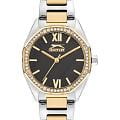 Женские кварцевые часы Slazenger SL.09.2301.3.06 — это элегантный и изысканный аксессуар, подчеркивающий стиль и утончённость. Безель и браслет выполнены из суперметалла с IP-покрытиемIP-покрытиеМетод ионного напыления. Демонстрирует повышенную устойчивость к истиранию, окислению и химическим веществам. Под воздействием высокого давления и температуры около 1500°C молекулы металла надёжно соединяются с частицами корпуса часов., защищён минеральным стекломМинеральное стеклоМинеральное стекло представляет собой искусственно выращенный минерал кварца. Такое стекло отличается особой устойчивостью к повреждениям и царапинам. Уступает по некоторым качествам сапфировому стеклу.. Циферблат чёрного цвета с волнистым рельефным рисунком оформлен штриховыми метками и римскими цифрами VI и XII, дополнен логотипом бренда. Безель гранёный, украшен паве из фианитов, придающих модели изысканное сияние. Заводная головка — граненая, добавляющая детали дизайна. Браслет из суперметалла фиксируется на раскладной застёжкеРаскладная застёжкаТакой тип застёжки используется только на браслетах из металла. Она никогда не раскрывается полностью, происходит разделение на 2 и более частей. Раскладывающая застёжка снизит вероятность потери часов к минимуму., обеспечивая надёжность и комфорт ношения. Водонепроницаемость 30 м позволяет использовать часы в повседневных условиях, защищая от случайных брызг и капель дождя. Модель идеально подходит как для повседневного, так и для торжественного образа.