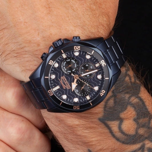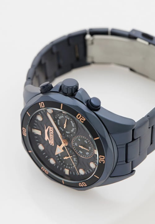 Мужские кварцевые часы Slazenger SL.09.2309.2.07 — это выразительный и функциональный аксессуар, сочетающий прочность, стиль и насыщенную комплектацию. Корпус и браслет выполнены из суперметалла с IP-покрытиемIP-покрытиеМетод ионного напыления. Демонстрирует повышенную устойчивость к истиранию, окислению и химическим веществам. Под воздействием высокого давления и температуры около 1500°C молекулы металла надёжно соединяются с частицами корпуса часов., защищён минеральным стекломМинеральное стеклоМинеральное стекло представляет собой искусственно выращенный минерал кварца. Такое стекло отличается особой устойчивостью к повреждениям и царапинам. Уступает по некоторым качествам сапфировому стеклу.. Циферблат синего цвета оформлен с вынесенными малыми циферблатами для индикации дня недели, даты и времени в 24-часовом формате. Стрелки и метки оснащены люминесцентным покрытиемЛюминесцентное покрытиеПозволяет считывать показания времени в темноте. Производители наносят на стрелки, часовые индексы, безель или поверхность циферблата светонакопительный состав, дающий холодное свечение., обеспечивающим хорошую читаемость в темноте. Заводная головка снабжена защитой, а задняя крышка — завинчивающаяся, что повышает надёжность конструкции. Браслет комбинированного цвета фиксируется на раскладной застёжкеРаскладная застёжкаТакой тип застёжки используется только на браслетах из металла. Она никогда не раскрывается полностью, происходит разделение на 2 и более частей. Раскладывающая застёжка снизит вероятность потери часов к минимуму., обеспечивая удобство и безопасность ношения. Водонепроницаемость 50 м позволяет использовать часы в повседневных условиях, защищая от случайных брызг и капель дождя. Модель подчёркивает индивидуальность владельца и идеально подходит как для повседневного, так и для делового образа.