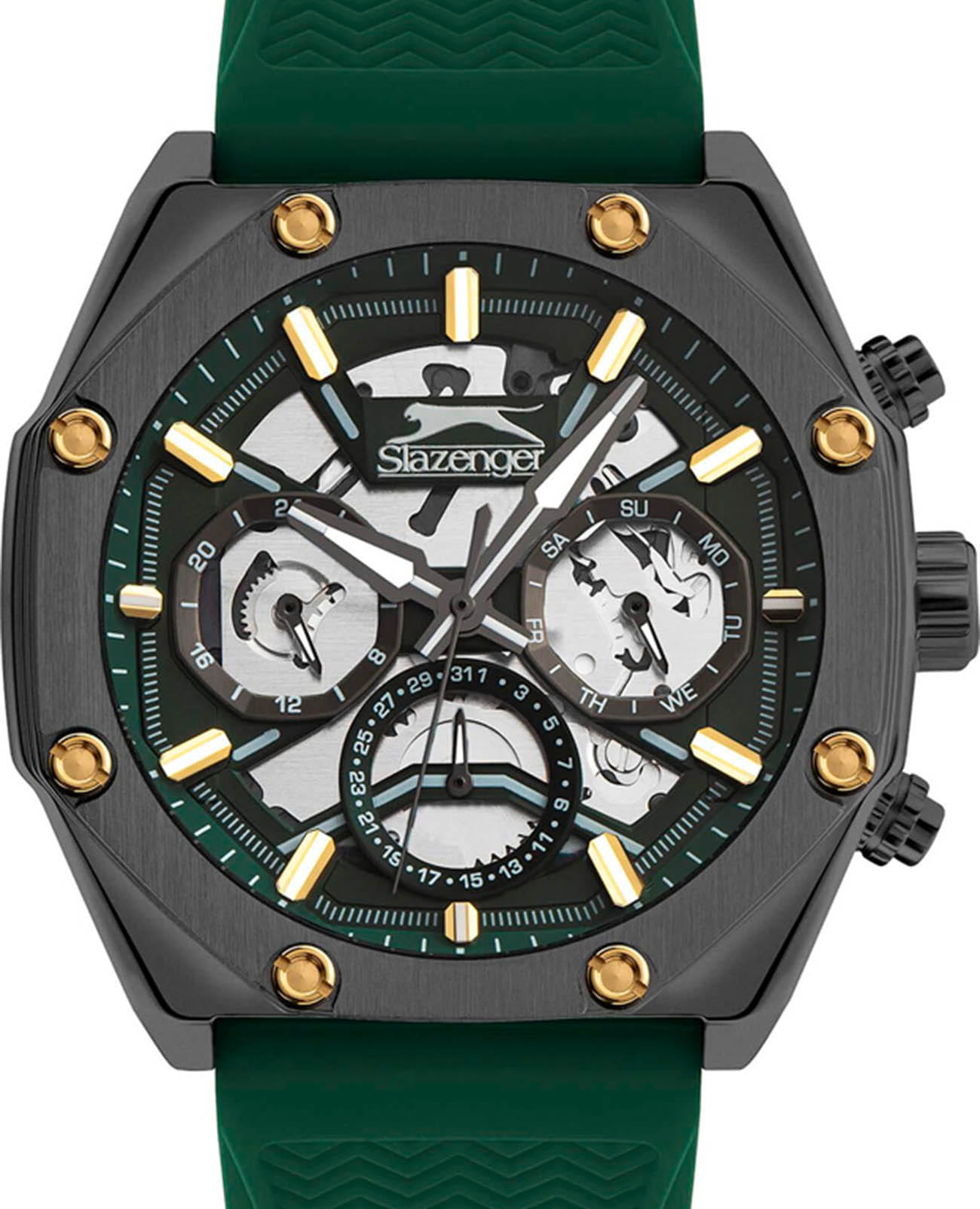 Мужские кварцевые часы Slazenger SL.09.2319.2.03 - это выразительный и функциональный аксессуар, сочетающий стиль, технологичность и насыщенную комплектацию. Корпус выполнен из суперметалла с IP-покрытиемIP-покрытиеМетод ионного напыления. Демонстрирует повышенную устойчивость к истиранию, окислению и химическим веществам. Под воздействием высокого давления и температуры около 1500°C молекулы металла надёжно соединяются с частицами корпуса часов., защищён минеральным стекломМинеральное стеклоМинеральное стекло представляет собой искусственно выращенный минерал кварца. Такое стекло отличается особой устойчивостью к повреждениям и царапинам. Уступает по некоторым качествам сапфировому стеклу.. Циферблат частично скелетонизирован и выполнен в зелёных тонах, что позволяет наблюдать за работой механизма. Часы оснащены вынесенными малыми циферблатами для индикации дня недели, даты и времени в 24-часовом формате. Стрелки и метки оснащены люминесцентным покрытиемЛюминесцентное покрытиеПозволяет считывать показания времени в темноте. Производители наносят на стрелки, часовые индексы, безель или поверхность циферблата светонакопительный состав, дающий холодное свечение., обеспечивающим хорошую читаемость в темноте. Удобный силиконовый ремешок зелёного цвета фиксируется на классической пряжке. Водонепроницаемость 50 м позволяет использовать часы в повседневных условиях, защищая от случайных брызг и капель дождя. Модель подчёркивает индивидуальность владельца и идеально подходит как для повседневного, так и для спортивного образа.
