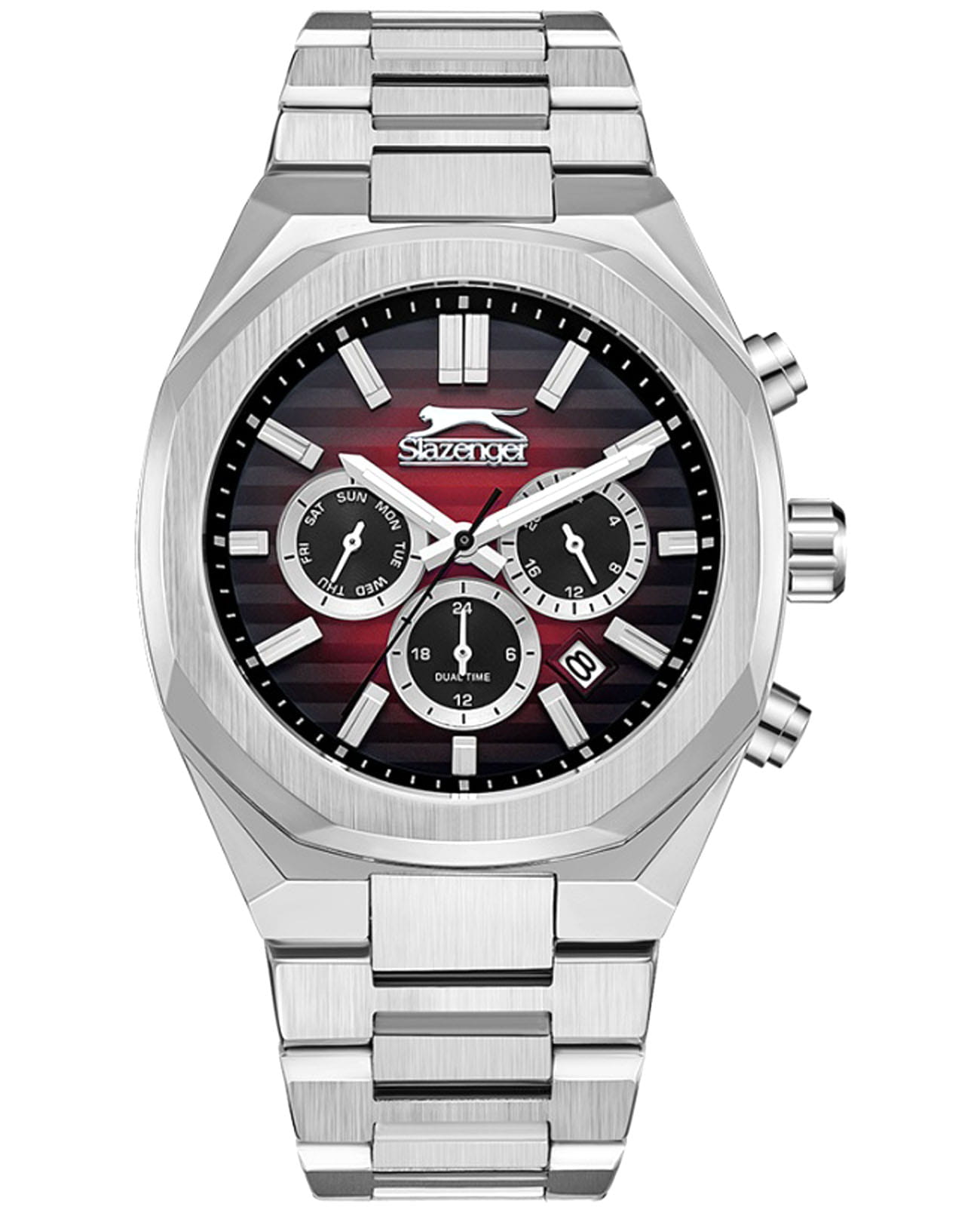 Мужские кварцевые часы Slazenger SL.09.2345.2.06 – идеальное сочетание классического дизайна и современных технологий, созданное для уверенных в себе мужчин. Корпус выполнен из суперметалла серебристого цвета, диаметром 43 мм и толщиной 12 мм, подчёркивает надежность модели и делает их идеальным аксессуаром для любой ситуации – будь то деловая встреча или повседневные выходы. Циферблат надёжно защищён минеральным стекломМинеральное стеклоМинеральное стекло представляет собой искусственно выращенный минерал кварца. Такое стекло отличается особой устойчивостью к повреждениям и царапинам. Уступает по некоторым качествам сапфировому стеклу., которое устойчиво к механическим повреждениям и сохраняет кристальную прозрачность. Браслет из суперметалла удобно облегает запястье и фиксируется с помощью раскладной застёжкиРаскладная застёжкаТакой тип застёжки используется только на браслетах из металла. Она никогда не раскрывается полностью, происходит разделение на 2 и более частей. Раскладывающая застёжка снизит вероятность потери часов к минимуму., обеспечивая надёжность и комфорт в повседневном ношении. Стрелки и метки покрыты люминесцентным покрытиемЛюминесцентное покрытиеПозволяет считывать показания времени в темноте. Производители наносят на стрелки, часовые индексы, безель или поверхность циферблата светонакопительный состав, дающий холодное свечение., обеспечивающим отличную читаемость в темноте. Эти часы станут не просто аксессуаром, а надежным спутником в любой ситуации, подчеркивая ваш безупречный вкус и деловой стиль. Окошко даты находится в положении между 4 и 5 часов. Вынесенный циферблат с 24-х часовым указателем времени. Водозащита до 50 метров позволит защитить корпус от случайных брызг или капель дождя. Функция GMTGMTОтображение времени второго часового пояса.Такая функция особенно актуальна для путешественников и бизнесменов,которые общаются с людьми из разных стран,теперь вы всегда будете знать,какой час у вашего партнёра или близкого человека. поможет отслеживать время второго часового поясаВторой часовой поясФункция, позволяющая отображать время двух часовых поясов одновременно..