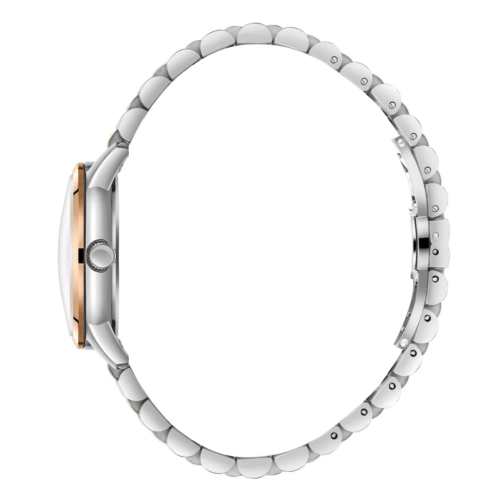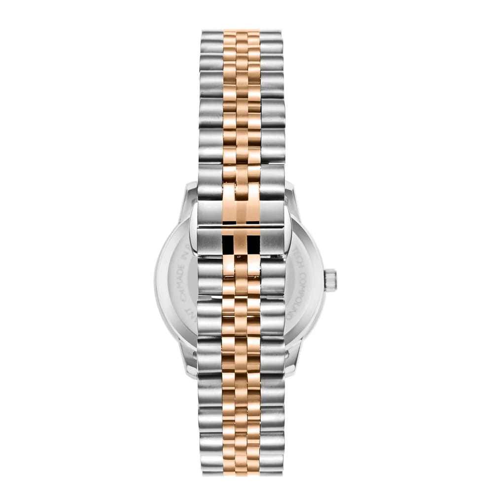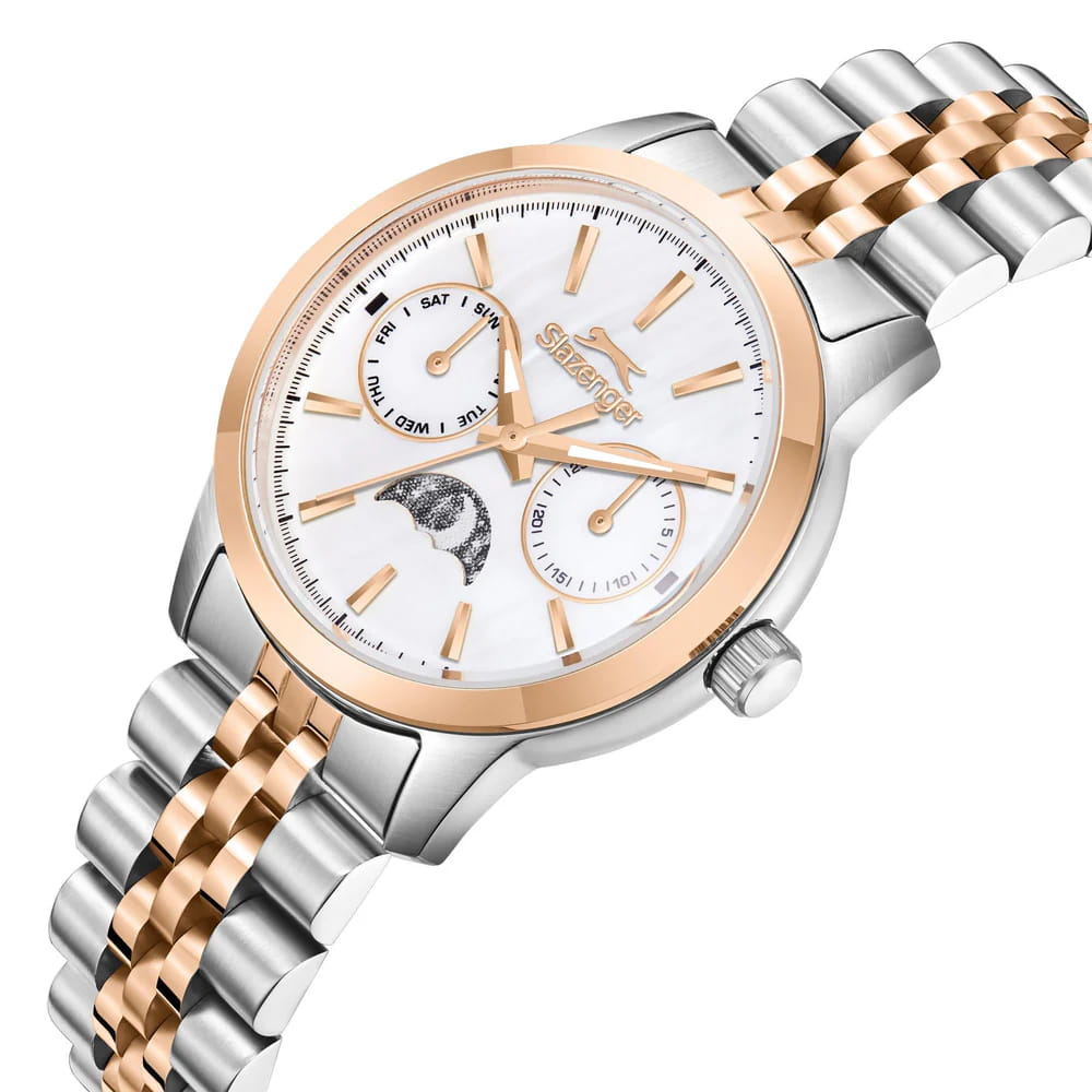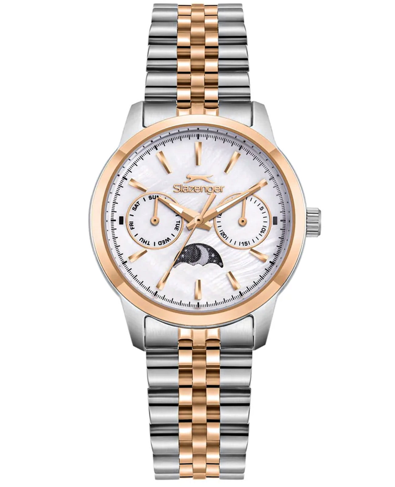 Женские кварцевые часы Slazenger — это выразительный и функциональный аксессуар. Корпус диаметром 33 мм и толщиной 10 мм выполнен из суперметалла. БезельБезельВнешний ободок, закрепляющий стекло. В спортивных часах так называется поворотное кольцо с делениями на циферблате, выполняет роль таймера – замеряет отрезки времени на шкале. Неподвижный безель – элемент декора. Однонаправленно вращающийся безель на дайверских часах позволяет фиксировать моменты погружения и выныривания на поверхность. из суперметалла с IP-покрытиемIP-покрытиеМетод ионного напыления. Демонстрирует повышенную устойчивость к истиранию, окислению и химическим веществам. Под воздействием высокого давления и температуры около 1500°C молекулы металла надёжно соединяются с частицами корпуса часов.. Циферблат белого цвета оформлен индексами и стрелками. Циферблат защищён минеральным стекломМинеральное стеклоМинеральное стекло представляет собой искусственно выращенный минерал кварца. Такое стекло отличается особой устойчивостью к повреждениям и царапинам. Уступает по некоторым качествам сапфировому стеклу.. Механизм — кварцевый калибр VX3HE11. Часы оснащены индикацией дня недели, даты и индикатором день/ночь, отображающим солнце или луну в зависимости от времени суток. Часы оснащены браслетом из суперметалла с IP-покрытиемIP-покрытиеМетод ионного напыления. Демонстрирует повышенную устойчивость к истиранию, окислению и химическим веществам. Под воздействием высокого давления и температуры около 1500°C молекулы металла надёжно соединяются с частицами корпуса часов. на застёжке «бабочка» с кнопкамиЗастёжка "бабочка"Такой вид застёжки дополняется предохранителями, помогающими избежать случайного раскрытия браслета. Обладают изящным исполнением. . Водонепроницаемость 50 м позволяет использовать часы в повседневных условиях. Идеальный выбор для тех, кто ценит стиль, функциональность и качество.