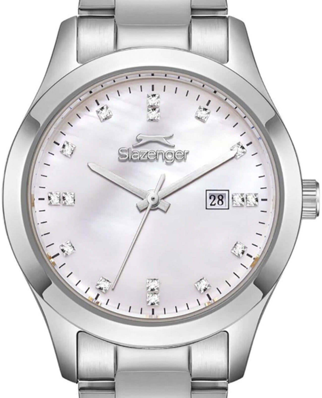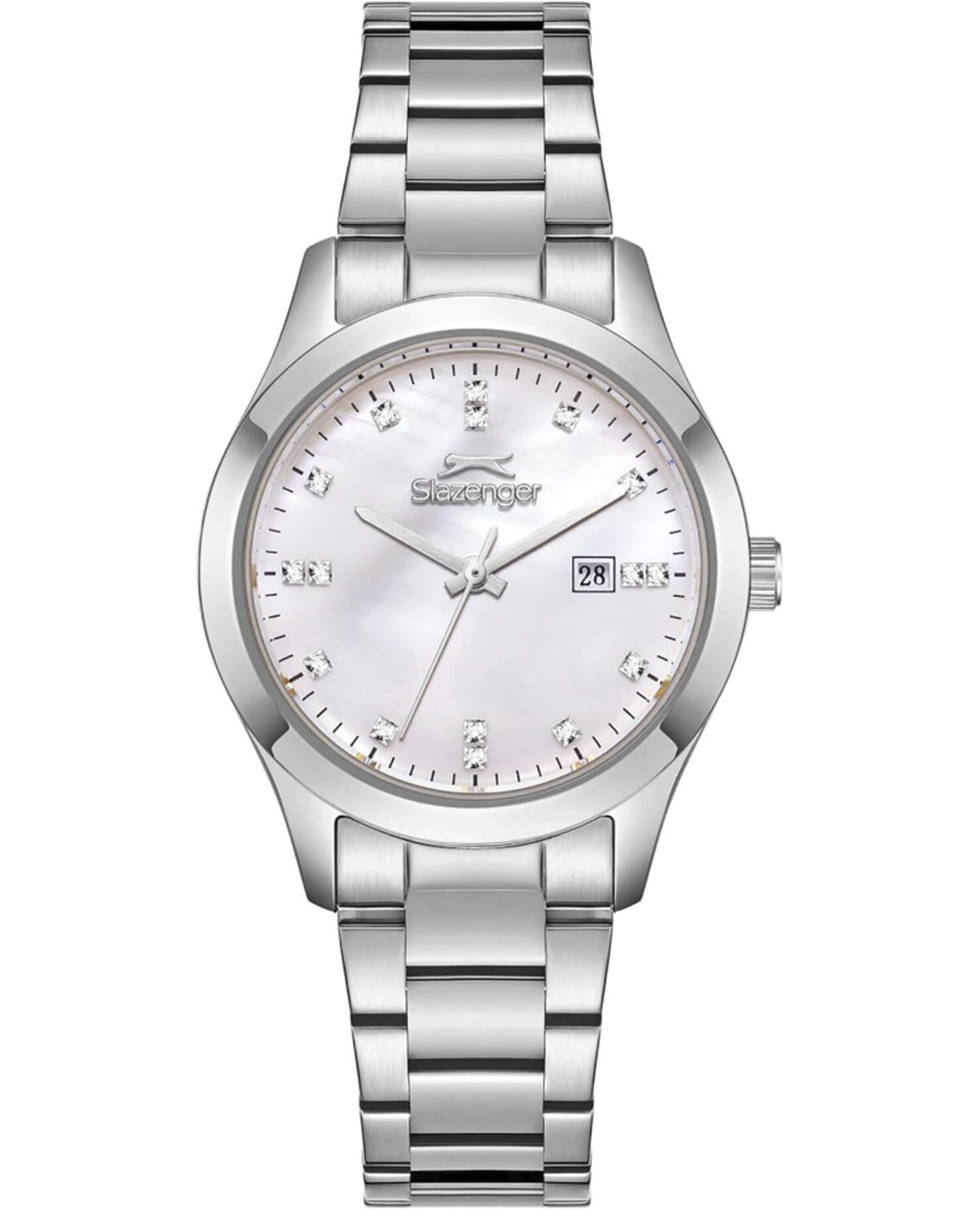 Женские кварцевые часы Slazenger — это элегантный аксессуар. Корпус диаметром 32 мм и толщиной 10 мм выполнен из нержавеющей стали 316L. Циферблат белого цвета с перламутровыми вставками оформлен индексами в виде фианитов. Циферблат защищён минеральным стекломМинеральное стеклоМинеральное стекло представляет собой искусственно выращенный минерал кварца. Такое стекло отличается особой устойчивостью к повреждениям и царапинам. Уступает по некоторым качествам сапфировому стеклу.. Механизм — кварцевый. Окошко даты расположено в положении 3 часов. Часы оснащены стальным браслетом с раскладной застёжкойРаскладная застёжкаТакой тип застёжки используется только на браслетах из металла. Она никогда не раскрывается полностью, происходит разделение на 2 и более частей. Раскладывающая застёжка снизит вероятность потери часов к минимуму.. Водонепроницаемость 50 м позволяет использовать часы в повседневных условиях. Гарантия — 12 месяцев. Идеальный выбор для тех, кто ценит стиль и качество.