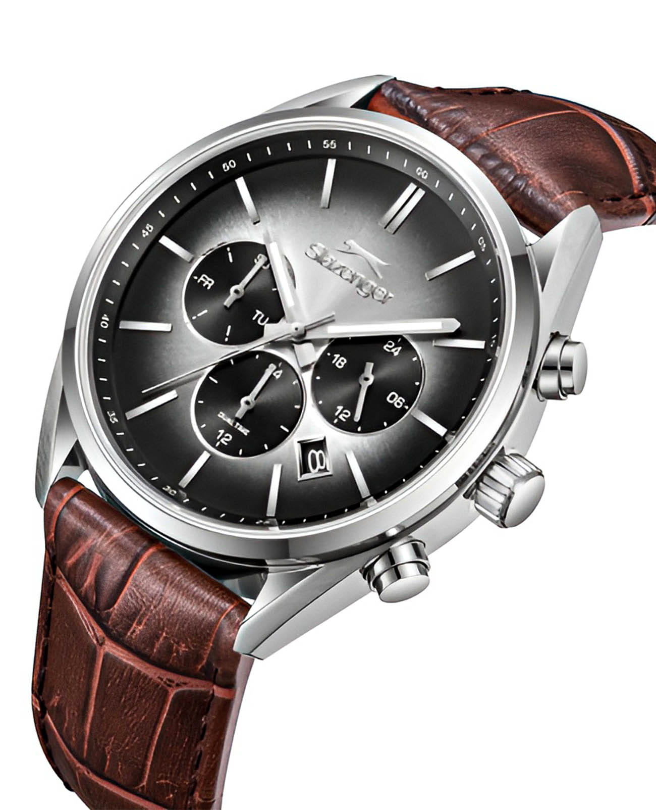 Мужские кварцевые часы Slazenger — это выразительный и функциональный аксессуар. Корпус диаметром 42 мм и толщиной 12 мм выполнен из нержавеющей стали 316L. Циферблат чёрного цвета оформлен индексами и стрелками. Циферблат защищён минеральным стекломМинеральное стеклоМинеральное стекло представляет собой искусственно выращенный минерал кварца. Такое стекло отличается особой устойчивостью к повреждениям и царапинам. Уступает по некоторым качествам сапфировому стеклу.. Механизм — кварцевый. Часы оснащены индикацией дня недели, даты, 12/24-часового формата времени и функцией второго часового пояса (GMT)Второй часовой поясФункция, позволяющая отображать время двух часовых поясов одновременно.. Окошко даты расположено между 4 и 5 часами. Стрелки и метки с люминесцентным покрытиемЛюминесцентное покрытиеПозволяет считывать показания времени в темноте. Производители наносят на стрелки, часовые индексы, безель или поверхность циферблата светонакопительный состав, дающий холодное свечение., обеспечивающим хорошую читаемость в темноте. Часы оснащены кожаным ремешком с стандартной застёжкой. Водонепроницаемость 100 м позволяет использовать часы для плавания и повседневного ношения. Гарантия — 12 месяцев. Идеальный выбор для тех, кто ценит стиль, функциональность и качество.