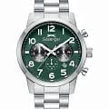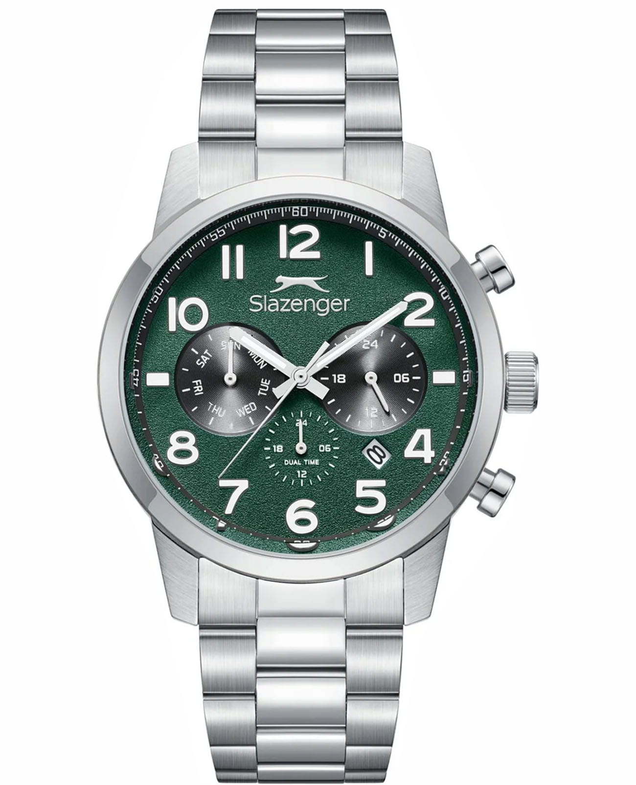 Мужские кварцевые часы Slazenger — это выразительный и функциональный аксессуар. Корпус диаметром 42 мм и толщиной 12 мм выполнен из нержавеющей стали 316L. Циферблат зелёного цвета оформлен индексами и стрелками. Окошко даты расположено на отметке в 6 часов. Указатель дня недели и 24-часовой формат времени вынесены на отдельные субциферблаты. Циферблат защищён минеральным стекломМинеральное стеклоМинеральное стекло представляет собой искусственно выращенный минерал кварца. Такое стекло отличается особой устойчивостью к повреждениям и царапинам. Уступает по некоторым качествам сапфировому стеклу.. Механизм — кварцевый калибр JP25. Часы оснащены функцией второго часового пояса (GMT)Второй часовой поясФункция, позволяющая отображать время двух часовых поясов одновременно.. Стрелки и метки с люминесцентным покрытиемЛюминесцентное покрытиеПозволяет считывать показания времени в темноте. Производители наносят на стрелки, часовые индексы, безель или поверхность циферблата светонакопительный состав, дающий холодное свечение., обеспечивающим хорошую читаемость в темноте. Часы оснащены стальным браслетом с раскладной застёжкойРаскладная застёжкаТакой тип застёжки используется только на браслетах из металла. Она никогда не раскрывается полностью, происходит разделение на 2 и более частей. Раскладывающая застёжка снизит вероятность потери часов к минимуму.. Водонепроницаемость 100 м позволяет использовать часы для плавания и повседневного ношения. Гарантия — 12 месяцев. Идеальный выбор для тех, кто ценит стиль, функциональность и качество.