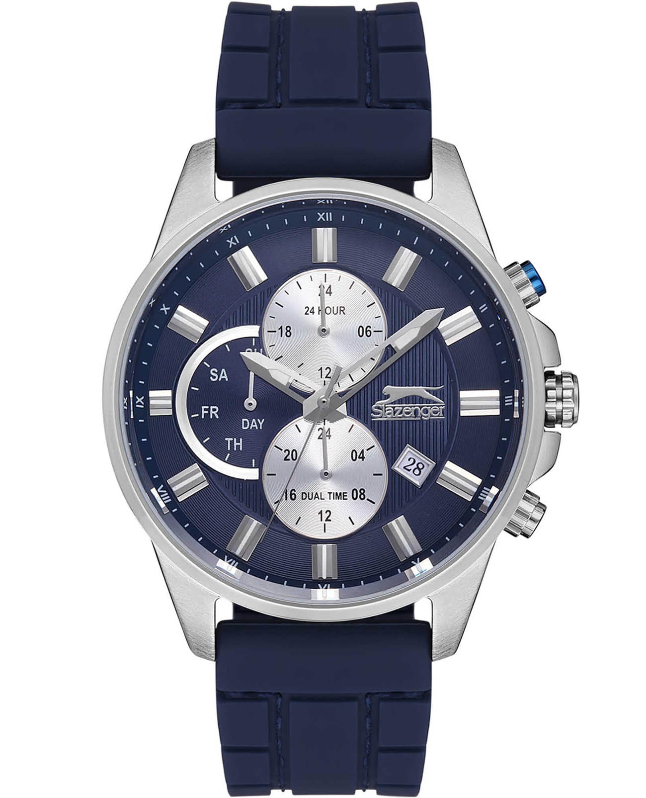 Часы Slazenger SL.09.6554.2.04 воплощают в себе элегантность и практичность, идеально подходящие для современных мужчин. Синий циферблат, защищенный минеральным стекломМинеральное стеклоМинеральное стекло представляет собой искусственно выращенный минерал кварца. Такое стекло отличается особой устойчивостью к повреждениям и царапинам. Уступает по некоторым качествам сапфировому стеклу., заключен в серебристый корпус диаметром 45 мм, который изготовлен из прочного суперметалла. Надежный кварцевый механизм обеспечивает точность, а водозащита 5 ATM делает их устойчивыми к воздействию воды. Силиконовый ремень со стандартной застежкой подчеркивает современный стиль и комфортно сидит на запястье. Часы оснащены 24-часовым указателем времени, а также функциями отображения даты и дня недели. Люминесцентное покрытиеЛюминесцентное покрытиеПозволяет считывать показания времени в темноте. Производители наносят на стрелки, часовые индексы, безель или поверхность циферблата светонакопительный состав, дающий холодное свечение. на стрелках и метках обеспечивает отличную видимость в темноте.