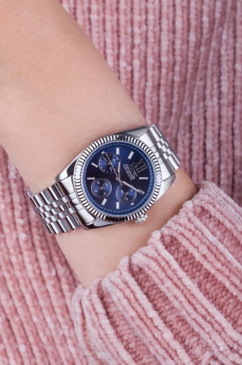 Женские элегантные наручные часы Slazenger SL.09.6556.4.01 сочетают в себе современный стиль и функциональность. Стильный корпус выполнен из суперметалла, придающий модели дополнительную прочность и элегантный внешний вид. Изысканный циферблат защищён минеральным стекломМинеральное стеклоМинеральное стекло представляет собой искусственно выращенный минерал кварца. Такое стекло отличается особой устойчивостью к повреждениям и царапинам. Уступает по некоторым качествам сапфировому стеклу., устойчивым к царапинам и повреждениям. Водонепроницаемость 5 АТМ позволяет использовать часы в повседневных условиях — при мытье рук или под лёгким дождём. Браслет из суперметалла и с раскладной застёжкойРаскладная застёжкаТакой тип застёжки используется только на браслетах из металла. Она никогда не раскрывается полностью, происходит разделение на 2 и более частей. Раскладывающая застёжка снизит вероятность потери часов к минимуму., обеспечивающий надёжную фиксацию и комфорт при ношении. На отдельные циферблаты вынесены указатели 24-часового времени, даты и дня недели, что делает использование часов особенно удобным в повседневной жизни. Cтрелки и метки покрыты люминесцентным покрытиемЛюминесцентное покрытиеПозволяет считывать показания времени в темноте. Производители наносят на стрелки, часовые индексы, безель или поверхность циферблата светонакопительный состав, дающий холодное свечение. для читаемости в условиях недостаточного освещения. Эта модель идеально подходит для женщин, ценящих стиль, функциональность и надёжность в одном аксессуаре.