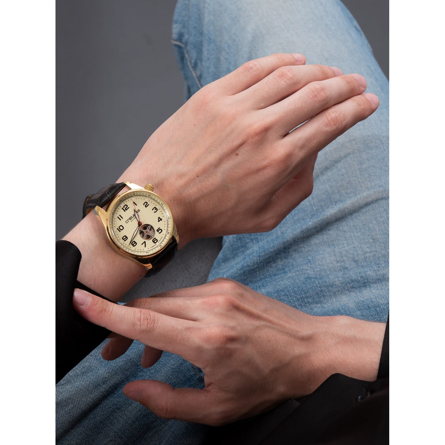 Водозащита 100 метров (10 ATM) позволяет использовать часы для плавания и других водных видов спорта. Ремешок из натуральной кожи со стандартной застёжкой обеспечивает комфортное ношение и надёжную фиксацию на запястье.