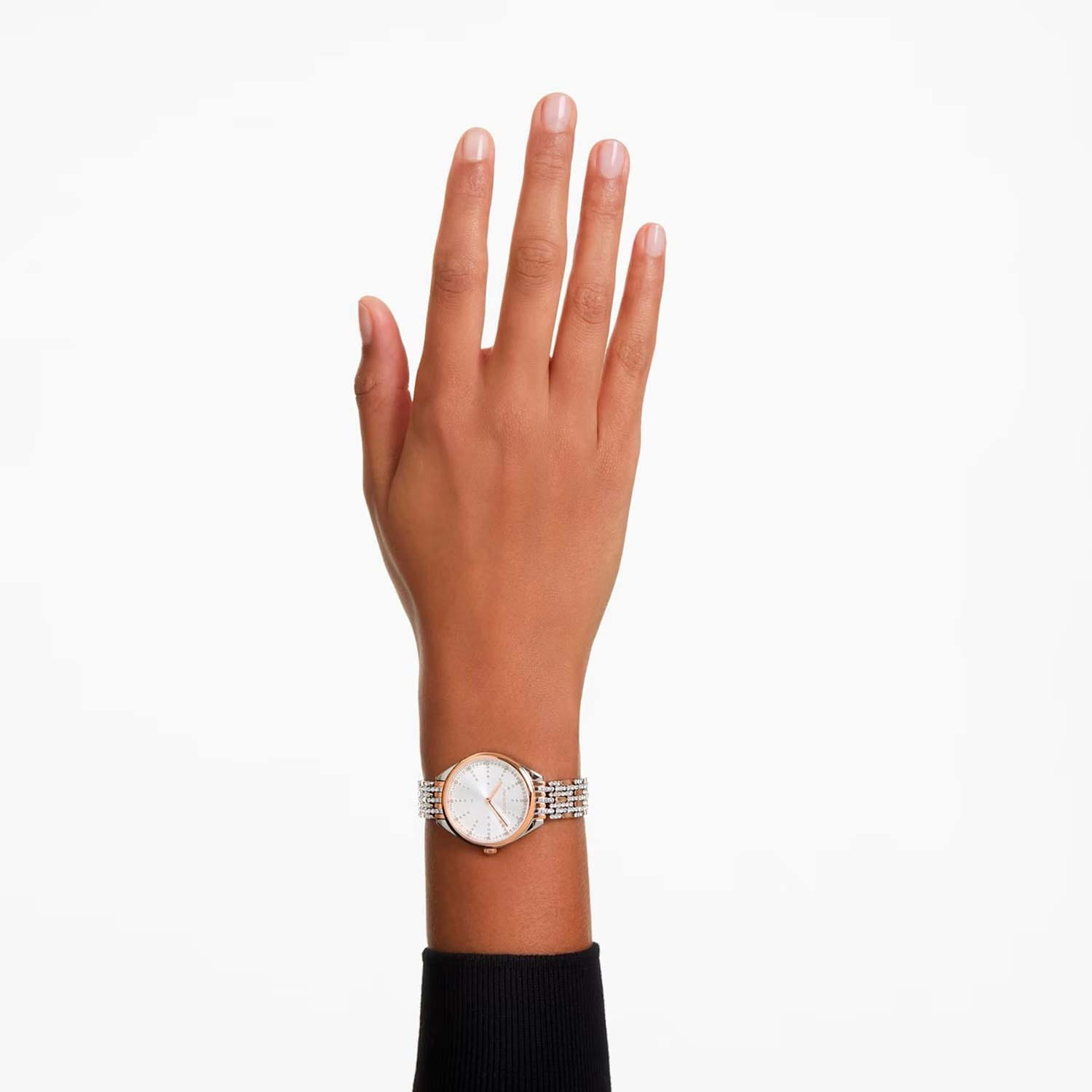 Часы Swarovski 5644053 – это воплощение изысканного дизайна и функциональности, созданное для тех, кто ценит красоту и точность. Золотистый круглый корпус и безелемБезельВнешний ободок, закрепляющий стекло. В спортивных часах так называется поворотное кольцо с делениями на циферблате, выполняет роль таймера – замеряет отрезки времени на шкале. Неподвижный безель – элемент декора. Однонаправленно вращающийся безель на дайверских часах позволяет фиксировать моменты погружения и выныривания на поверхность. из нержавеющей стали PVDPVDУльтратонкое покрытие наносится в технике вакуумного напыления, сочетает в себе нитрид титана особой прочности со слоем золота или оксида хрома. Несёт в себе декоративную или защитную функцию. покрытием, украшенным паве из тридцати мерцающих кристаллов. Под минеральным стекломМинеральное стеклоМинеральное стекло представляет собой искусственно выращенный минерал кварца. Такое стекло отличается особой устойчивостью к повреждениям и царапинам. Уступает по некоторым качествам сапфировому стеклу. открывается серебристый циферблат украшен гильошированным узором и кристаллами для индексных меток. Рифленая заводная головка украшена кристаллом круглой огранки. Стальной браслет с PVDPVDУльтратонкое покрытие наносится в технике вакуумного напыления, сочетает в себе нитрид титана особой прочности со слоем золота или оксида хрома. Несёт в себе декоративную или защитную функцию. покрытием и застежкой «бабочка»Застёжка "бабочка"Такой вид застёжки дополняется предохранителями, помогающими избежать случайного раскрытия браслета. Обладают изящным исполнением. , декорирован кристаллами Swarovski. Водозащита 50WR делает их устойчивыми к влаге, позволяя наслаждаться стильным аксессуаром в любых условиях.