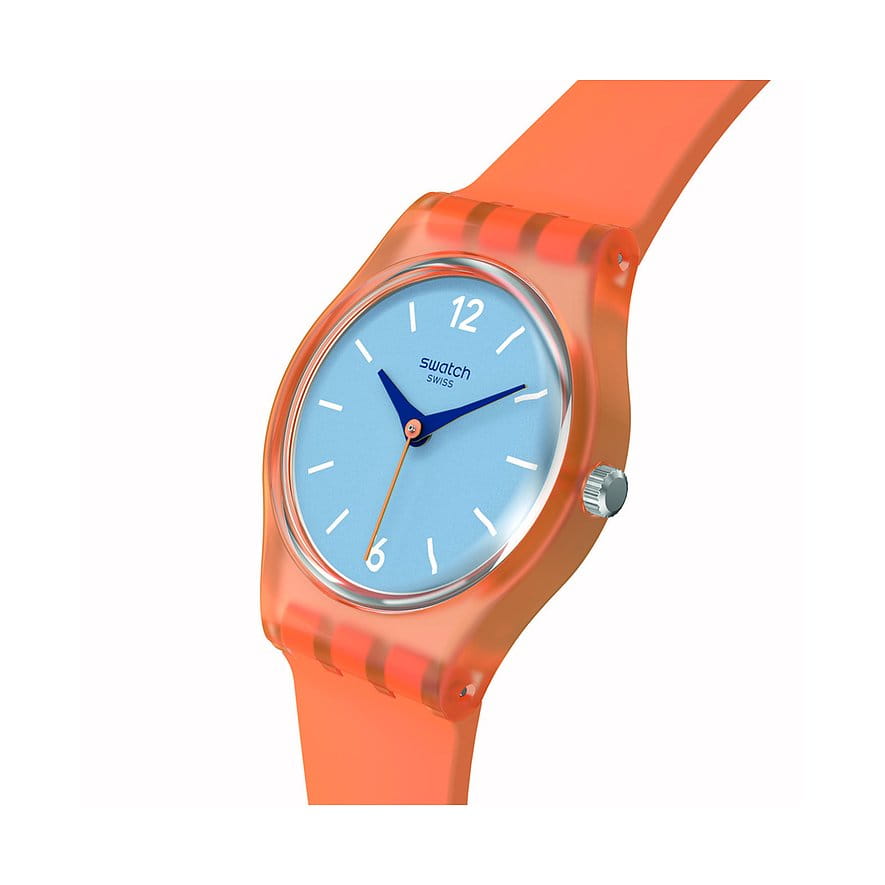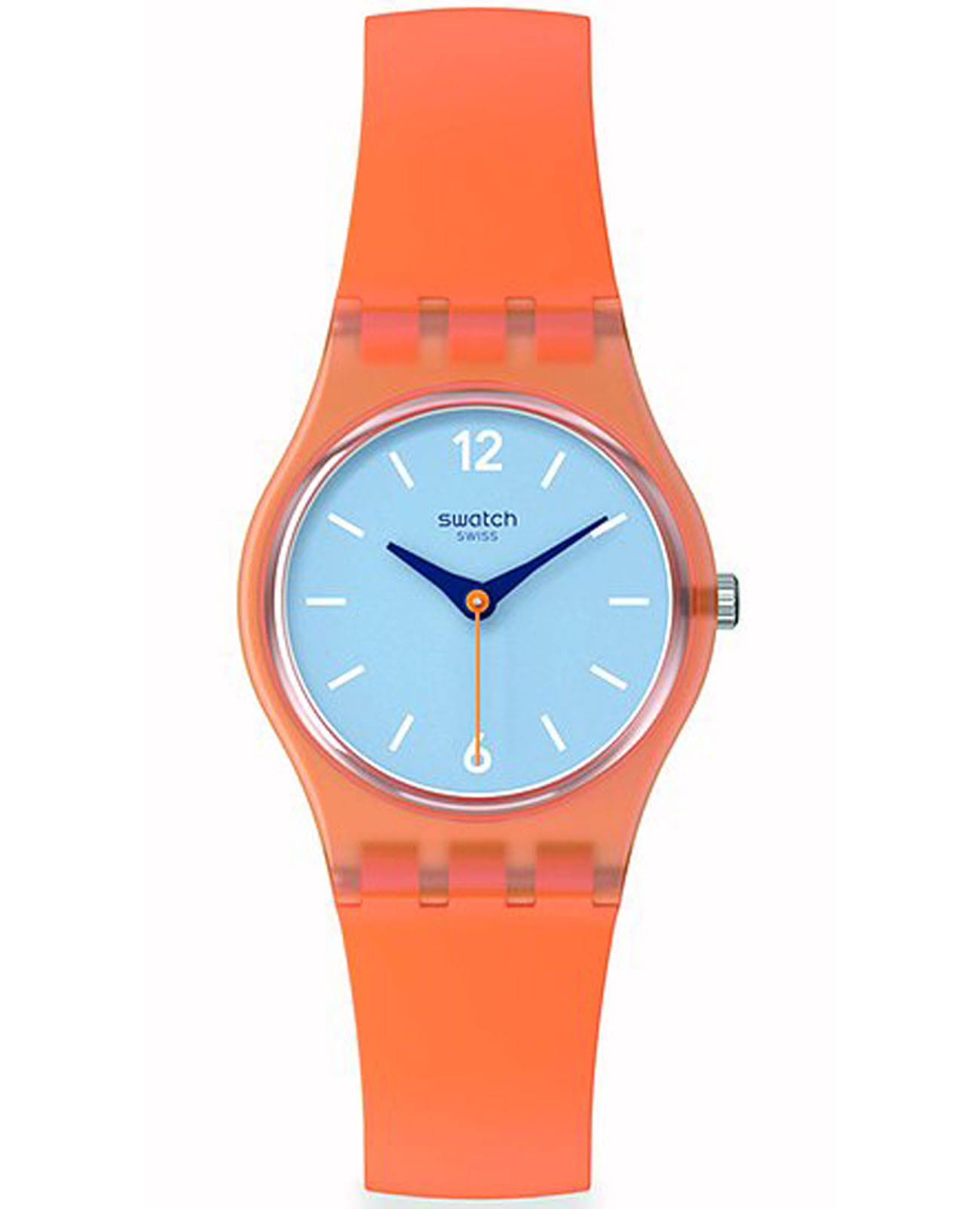 Озорная модель часов Swatch Lady LO116 из коллекции Swatch Lady. Эти часы имеют прозрачный корпус и голубой циферблат с белыми печатными цифрами и стрелками синего цвета, что придает им яркий и игривый вид. С лицевой стороны ремешок оранжевый, что добавляет оригинальности. Водостойкость модели составляет 30 метров, что делает их подходящими для повседневного использования.