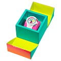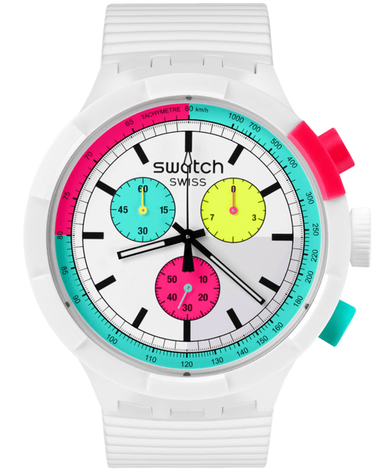 Часы Swatch SB06W100 — это стильный и современный аксессуар для тех, кто ценит лёгкость и комфорт. Часы идеально подойдут как для мужчин, так и для женщин.Эти ретро-часы с массивным циферблатом напоминают WHITE HORSES CHRONO SCW100, хронометр Swatch из 90-х. Часы с характерным дизайном и яркой кнопкой хронографаХронографФункция позволяет измерять отрезки времени с особой точностью: часы, минуты, секунды. Верным признаком хронографа является наличие на циферблате 3 дополнительных окошек-счётчиков. на двух часах – это идеальные часы, чтобы достичь неожиданных побед. На их необычайно красочном неоновом циферблате с белым корпусом шкала тахиметраТахиметрРазмеченная шкала, располагается на ободке или безеле часов. Тахиметр позволяет рассчитать скорость на определённом участке пути, расстояние измеряется в километрах или милях.. На часовую, минутную стрелки нанесено люминесцентное покрытиеЛюминесцентное покрытиеПозволяет считывать показания времени в темноте. Производители наносят на стрелки, часовые индексы, безель или поверхность циферблата светонакопительный состав, дающий холодное свечение., которое светится в темноте, создавая необычное изображение. Модель дополнена белым ремешком из биоматериала. Водозащита 30 метров делает часы практичными для повседневного использования. Эти часы подойдут для повседневного ношения и станут ярким акцентом в вашем наряде.