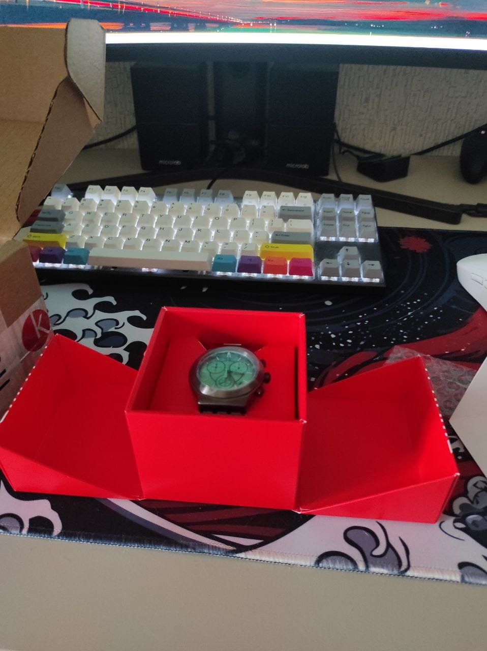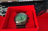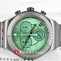 Часы Swatch YVM407G — это стильный и современный аксессуар для тех, кто ценит лёгкость и комфорт. Этот стильный хронографХронографФункция позволяет измерять отрезки времени с особой точностью: часы, минуты, секунды. Верным признаком хронографа является наличие на циферблате 3 дополнительных окошек-счётчиков. оснащен зеленым циферблатом с радиальной полировкой, черными часовой и минутной стрелками-скелетонами. Кончик зеленой секундной стрелки хронографа светится в темноте благодаря люминесцентному покрытиюЛюминесцентное покрытиеПозволяет считывать показания времени в темноте. Производители наносят на стрелки, часовые индексы, безель или поверхность циферблата светонакопительный состав, дающий холодное свечение.. Стрелки мини-циферблатов черные. На внешнее кольцо темно-серой расцветки нанесен черно-зеленый принт с минутной шкалой. Часовые индексы светятся в темноте благодаря люминесцентному покрытиюЛюминесцентное покрытиеПозволяет считывать показания времени в темноте. Производители наносят на стрелки, часовые индексы, безель или поверхность циферблата светонакопительный состав, дающий холодное свечение., а между отметками 4 и 5 часов расположено черное окошко календаря с белым принтом. Матированный корпус, безельБезельВнешний ободок, закрепляющий стекло. В спортивных часах так называется поворотное кольцо с делениями на циферблате, выполняет роль таймера – замеряет отрезки времени на шкале. Неподвижный безель – элемент декора. Однонаправленно вращающийся безель на дайверских часах позволяет фиксировать моменты погружения и выныривания на поверхность., пушеры и браслет с застёжкой «бабочка»Застёжка "бабочка"Такой вид застёжки дополняется предохранителями, помогающими избежать случайного раскрытия браслета. Обладают изящным исполнением. выполнены из нержавеющей стали с черным PVDPVDУльтратонкое покрытие наносится в технике вакуумного напыления, сочетает в себе нитрид титана особой прочности со слоем золота или оксида хрома. Несёт в себе декоративную или защитную функцию. покрытием. Водозащита 30 метров делает часы практичными для повседневного использования. Эти часы подойдут для повседневного ношения и станут ярким акцентом в вашем наряде.