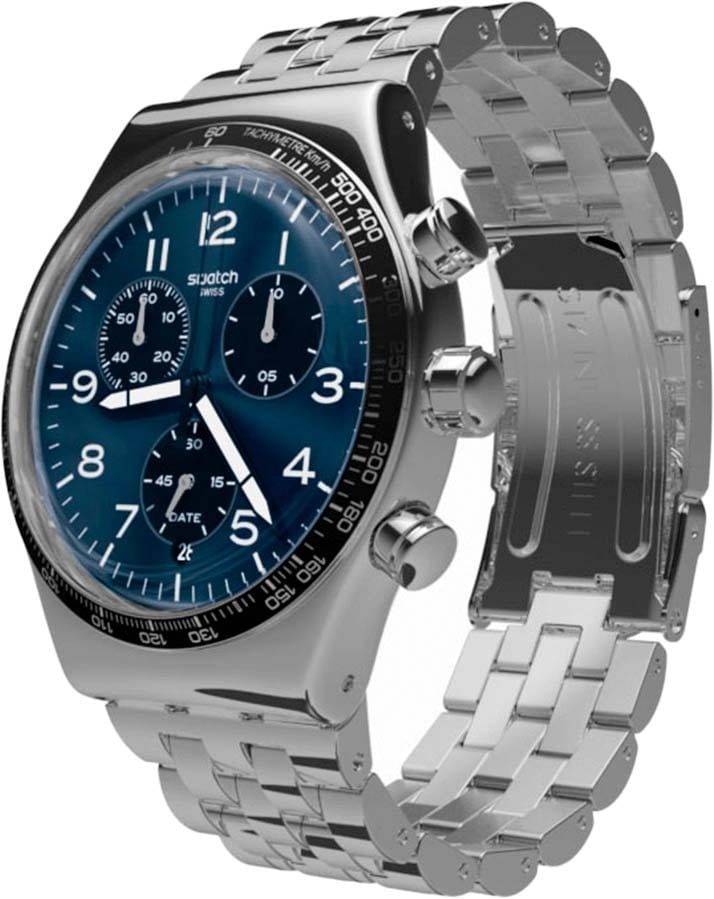 Часы Swatch YVS423GC — это стильный и современный аксессуар для тех, кто ценит лёгкость и комфорт. Этот стильный хронографХронографФункция позволяет измерять отрезки времени с особой точностью: часы, минуты, секунды. Верным признаком хронографа является наличие на циферблате 3 дополнительных окошек-счётчиков. с неподвластным времени дизайном для тех, кто всегда в пути, имеют матовый синий циферблат с белыми арабскими цифрами, серебристыми и белыми принтами, три счетчика и окошко даты в положении "6 часов". Изысканный стиль часов подчеркивают корпус из полированной нержавеющей стали и черный безельБезельВнешний ободок, закрепляющий стекло. В спортивных часах так называется поворотное кольцо с делениями на циферблате, выполняет роль таймера – замеряет отрезки времени на шкале. Неподвижный безель – элемент декора. Однонаправленно вращающийся безель на дайверских часах позволяет фиксировать моменты погружения и выныривания на поверхность. с PVDPVDУльтратонкое покрытие наносится в технике вакуумного напыления, сочетает в себе нитрид титана особой прочности со слоем золота или оксида хрома. Несёт в себе декоративную или защитную функцию. покрытием. Ремешок из полированной нержавеющей стали с традиционным узором звеньев и раскладной застёжкойРаскладная застёжкаТакой тип застёжки используется только на браслетах из металла. Она никогда не раскрывается полностью, происходит разделение на 2 и более частей. Раскладывающая застёжка снизит вероятность потери часов к минимуму. дополняют дизайн. На часовую, минутную стрелки нанесено люминесцентное покрытиеЛюминесцентное покрытиеПозволяет считывать показания времени в темноте. Производители наносят на стрелки, часовые индексы, безель или поверхность циферблата светонакопительный состав, дающий холодное свечение., которое светится в темноте, создавая необычное изображение. Водозащита 30 метров делает часы практичными для повседневного использования. Эти часы подойдут для повседневного ношения и станут ярким акцентом в вашем наряде.