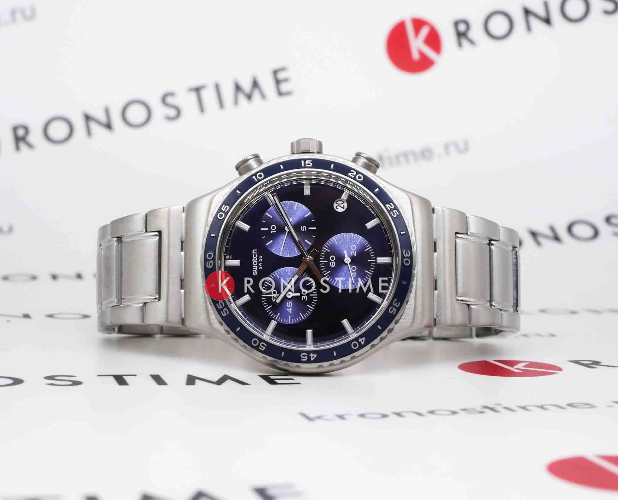Часы Swatch YVS496G — это стильный и современный аксессуар для тех, кто ценит лёгкость и комфорт. Эта стильная модель часов из нержавеющей стали дополнена матовым металлическим браслетом из нержавеющей стали со съемными звеньями и застёжкой «бабочка»Застёжка "бабочка"Такой вид застёжки дополняется предохранителями, помогающими избежать случайного раскрытия браслета. Обладают изящным исполнением. . Синий циферблат с радиальной полировкой оснащен хронографомХронографФункция позволяет измерять отрезки времени с особой точностью: часы, минуты, секунды. Верным признаком хронографа является наличие на циферблате 3 дополнительных окошек-счётчиков. и светящимися в темноте индексами и стрелками из-за люминесцентного покрытияЛюминесцентное покрытиеПозволяет считывать показания времени в темноте. Производители наносят на стрелки, часовые индексы, безель или поверхность циферблата светонакопительный состав, дающий холодное свечение. заключен в матовый корпус из нержавеющей стали. Завершают образ индикатор даты в положении «4 часа» на циферблате, а также серебристые цифры и индексы на синем безелеБезельВнешний ободок, закрепляющий стекло. В спортивных часах так называется поворотное кольцо с делениями на циферблате, выполняет роль таймера – замеряет отрезки времени на шкале. Неподвижный безель – элемент декора. Однонаправленно вращающийся безель на дайверских часах позволяет фиксировать моменты погружения и выныривания на поверхность. из нержавеющей стали с PVDPVDУльтратонкое покрытие наносится в технике вакуумного напыления, сочетает в себе нитрид титана особой прочности со слоем золота или оксида хрома. Несёт в себе декоративную или защитную функцию. покрытием. Водозащита 30 метров делает часы практичными для повседневного использования. Эти часы подойдут для повседневного ношения и станут ярким акцентом в вашем наряде.