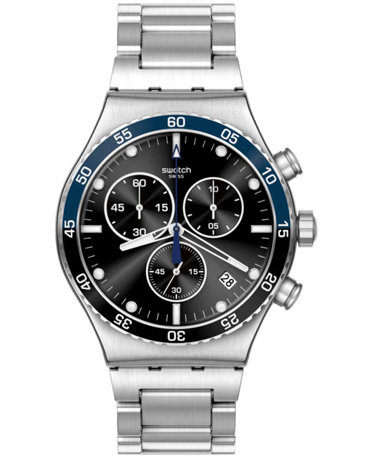 Часы Swatch YVS507G — это стильный и современный аксессуар для тех, кто ценит лёгкость и комфорт. Эта стильная модель часов из нержавеющей стали дополнена полированным металлическим браслетом из нержавеющей стали со съемными звеньями и застёжкой «бабочка»Застёжка "бабочка"Такой вид застёжки дополняется предохранителями, помогающими избежать случайного раскрытия браслета. Обладают изящным исполнением. . Черный циферблат с радиальной полировкой оснащен хронографомХронографФункция позволяет измерять отрезки времени с особой точностью: часы, минуты, секунды. Верным признаком хронографа является наличие на циферблате 3 дополнительных окошек-счётчиков. и светящимися в темноте индексами и стрелками из-за люминесцентного покрытияЛюминесцентное покрытиеПозволяет считывать показания времени в темноте. Производители наносят на стрелки, часовые индексы, безель или поверхность циферблата светонакопительный состав, дающий холодное свечение. заключен в матовый корпус из нержавеющей стали. Завершают образ индикатор даты в положении «4:30» на циферблате, а также серебристые цифры и индексы на синем безелеБезельВнешний ободок, закрепляющий стекло. В спортивных часах так называется поворотное кольцо с делениями на циферблате, выполняет роль таймера – замеряет отрезки времени на шкале. Неподвижный безель – элемент декора. Однонаправленно вращающийся безель на дайверских часах позволяет фиксировать моменты погружения и выныривания на поверхность. из нержавеющей стали с PVDPVDУльтратонкое покрытие наносится в технике вакуумного напыления, сочетает в себе нитрид титана особой прочности со слоем золота или оксида хрома. Несёт в себе декоративную или защитную функцию. покрытием. Водозащита 30 метров делает часы практичными для повседневного использования. Эти часы подойдут для повседневного ношения и станут ярким акцентом в вашем наряде.