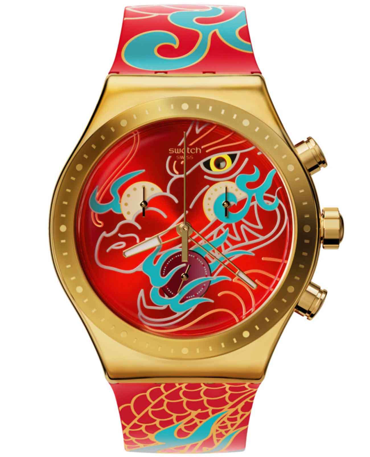 Часы Swatch YVZ100 — это стильный и современный аксессуар для тех, кто ценит лёгкость и комфорт. Этот красный хронографХронографФункция позволяет измерять отрезки времени с особой точностью: часы, минуты, секунды. Верным признаком хронографа является наличие на циферблате 3 дополнительных окошек-счётчиков. с блестящим золотым корпусом и безелемБезельВнешний ободок, закрепляющий стекло. В спортивных часах так называется поворотное кольцо с делениями на циферблате, выполняет роль таймера – замеряет отрезки времени на шкале. Неподвижный безель – элемент декора. Однонаправленно вращающийся безель на дайверских часах позволяет фиксировать моменты погружения и выныривания на поверхность. с PVDPVDУльтратонкое покрытие наносится в технике вакуумного напыления, сочетает в себе нитрид титана особой прочности со слоем золота или оксида хрома. Несёт в себе декоративную или защитную функцию. покрытием и такой же пряжкой на ремешке украшен изображением дракона. Цветной принт размещен как на циферблате с радиальной шлифовкой, так и на ремешке. На черные тренчики нанесены красная и золотистая надписи. На часовую и минутную стрелки нанесено люминесцентное покрытиеЛюминесцентное покрытиеПозволяет считывать показания времени в темноте. Производители наносят на стрелки, часовые индексы, безель или поверхность циферблата светонакопительный состав, дающий холодное свечение., которое светится в темноте, создавая необычное изображение. Водозащита 30 метров делает часы практичными для повседневного использования. Эти часы подойдут для повседневного ношения и станут ярким акцентом в вашем наряде.