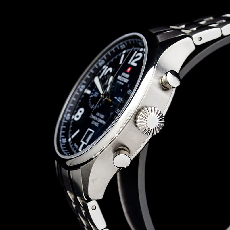 Часы-хронографХронографФункция позволяет измерять отрезки времени с особой точностью: часы, минуты, секунды. Верным признаком хронографа является наличие на циферблате 3 дополнительных окошек-счётчиков. с секундомеромСекундомерСекундоме́р — прибор, способный измерять интервалы времени с точностью до долей секунды.. Кварцевый механизм с высокой точностью. минеральное стеклоМинеральное стеклоМинеральное стекло представляет собой искусственно выращенный минерал кварца. Такое стекло отличается особой устойчивостью к повреждениям и царапинам. Уступает по некоторым качествам сапфировому стеклу. устойчивое к появлению царапин, обладающее высокой прозрачностью. Стрелки и метки с люминесцентным покрытиемЛюминесцентное покрытиеПозволяет считывать показания времени в темноте. Производители наносят на стрелки, часовые индексы, безель или поверхность циферблата светонакопительный состав, дающий холодное свечение.. Класс водозащиты: 100 метров, позволит плавать, нырять и заниматься другими водными видами спорта. Корпус часов изготовлен из нержавеющей стали. Браслет с раскладной застёжкойРаскладная застёжкаТакой тип застёжки используется только на браслетах из металла. Она никогда не раскрывается полностью, происходит разделение на 2 и более частей. Раскладывающая застёжка снизит вероятность потери часов к минимуму..
