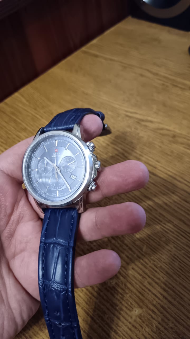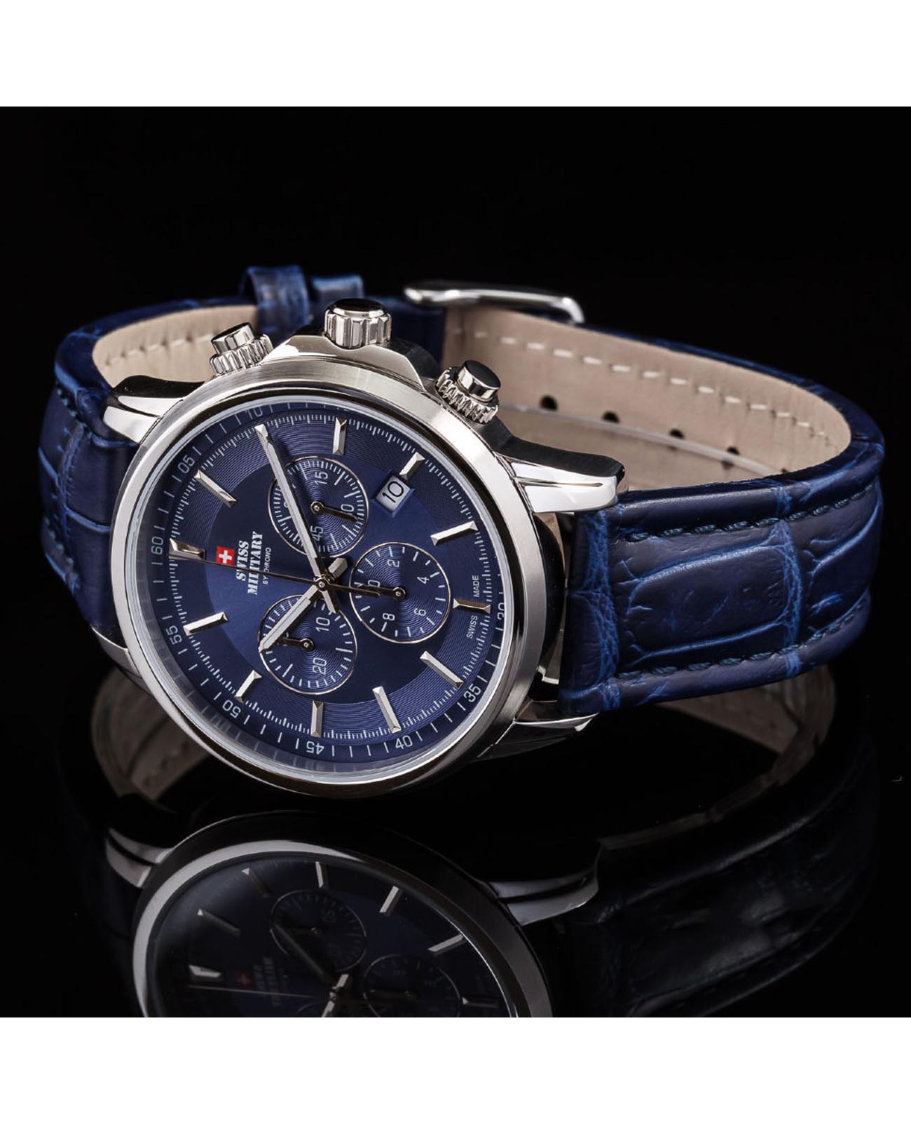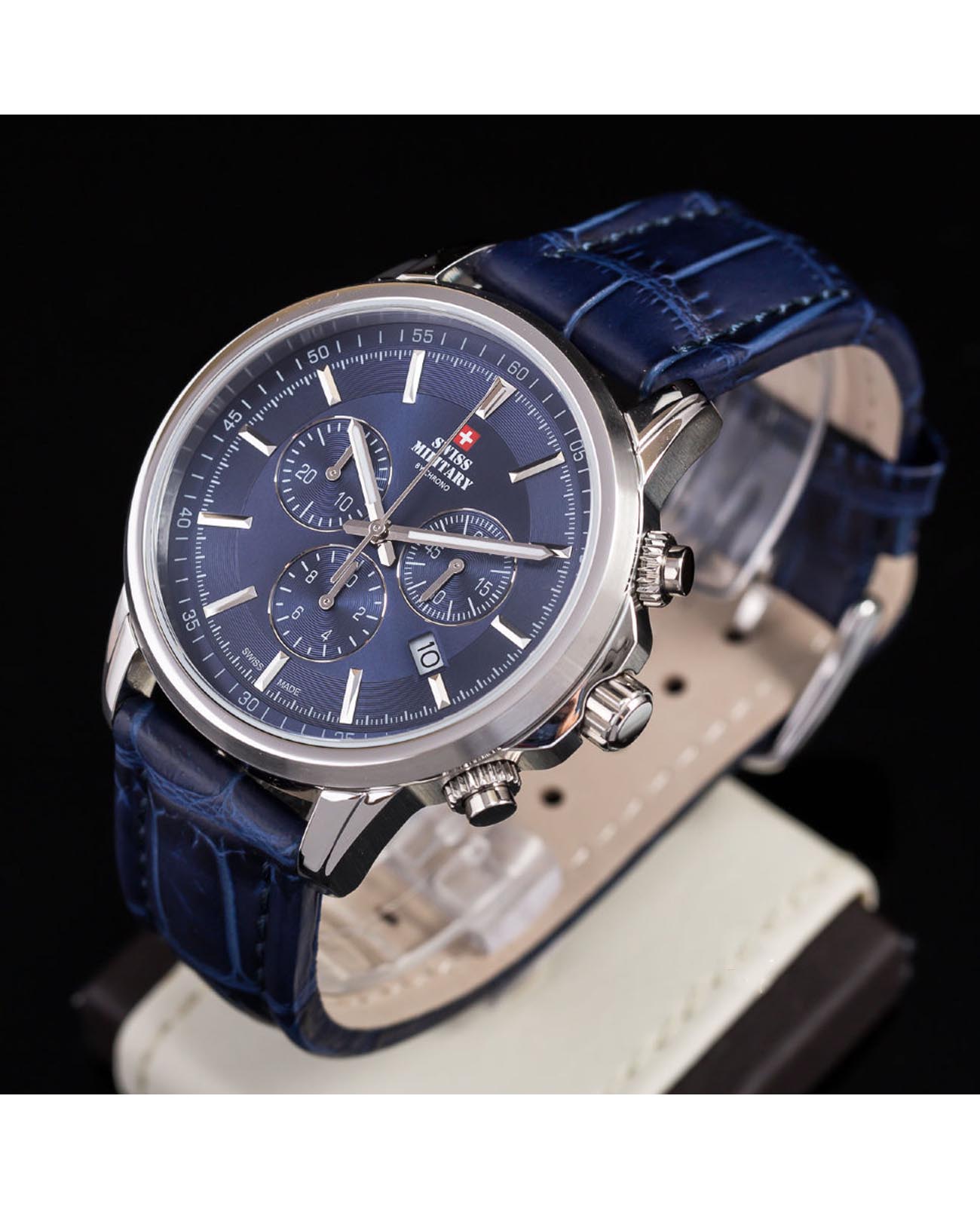 Мужские швейцарские часы-хронографХронографФункция позволяет измерять отрезки времени с особой точностью: часы, минуты, секунды. Верным признаком хронографа является наличие на циферблате 3 дополнительных окошек-счётчиков. с секундомеромСекундомерСекундоме́р — прибор, способный измерять интервалы времени с точностью до долей секунды. Swiss Military by Chrono SM34052.13, кварцевый механизм с высокой точностью. Сапфировое стеклоСапфировое стеклоПрочный и надёжный материал из кристалла сапфира синтетического происхождения, характеризующийся особой твёрдостью и устойчивостью к царапинам и повреждениям. устойчивое к мелким механическим повреждениям. Корпус часов изготовлен из нержавеющей стали. На циферблате расположены два дополнительных индикатора и окошко даты. Окошко даты находится в положении 4 часов. Стрелки с люминесцентным покрытиемЛюминесцентное покрытиеПозволяет считывать показания времени в темноте. Производители наносят на стрелки, часовые индексы, безель или поверхность циферблата светонакопительный состав, дающий холодное свечение.. Класс водозащиты: 100 метров, позволит плавать, нырять и заниматься другими водными видами спорта. Кожаный ремешок на стандартной застёжке.