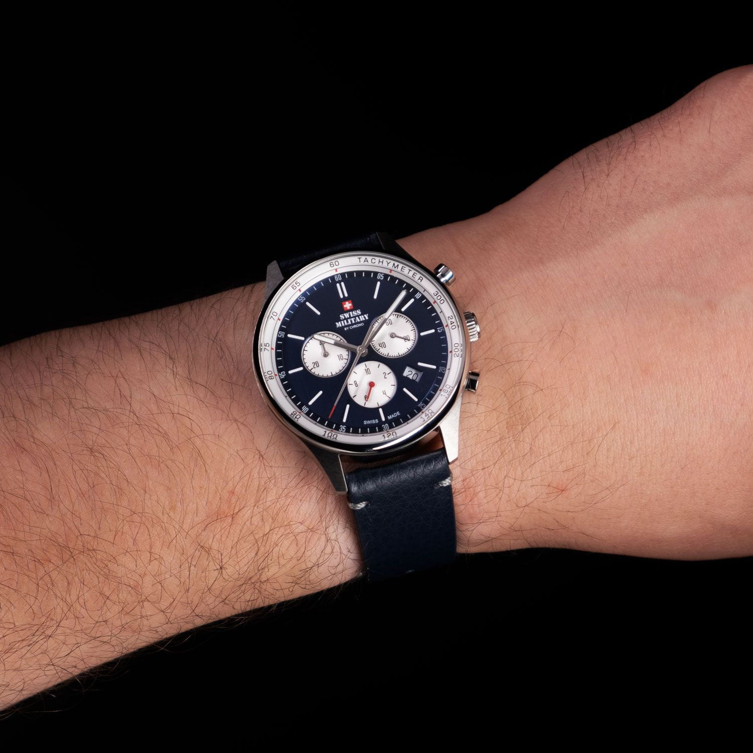 Мужские швейцарские наручные часы-хронографХронографФункция позволяет измерять отрезки времени с особой точностью: часы, минуты, секунды. Верным признаком хронографа является наличие на циферблате 3 дополнительных окошек-счётчиков. Swiss Military by Chrono SM34013.08, кварцевый механизм с высокой точностью. Класс водозащиты: 100 метров, позволит плавать, нырять и заниматься другими водными видами спорта. Стрелки с люминесцентным покрытиемЛюминесцентное покрытиеПозволяет считывать показания времени в темноте. Производители наносят на стрелки, часовые индексы, безель или поверхность циферблата светонакопительный состав, дающий холодное свечение.. Корпус часов изготовлен из стали. Минеральное стеклоМинеральное стеклоМинеральное стекло представляет собой искусственно выращенный минерал кварца. Такое стекло отличается особой устойчивостью к повреждениям и царапинам. Уступает по некоторым качествам сапфировому стеклу.. Ремешок с классической застежкой.