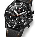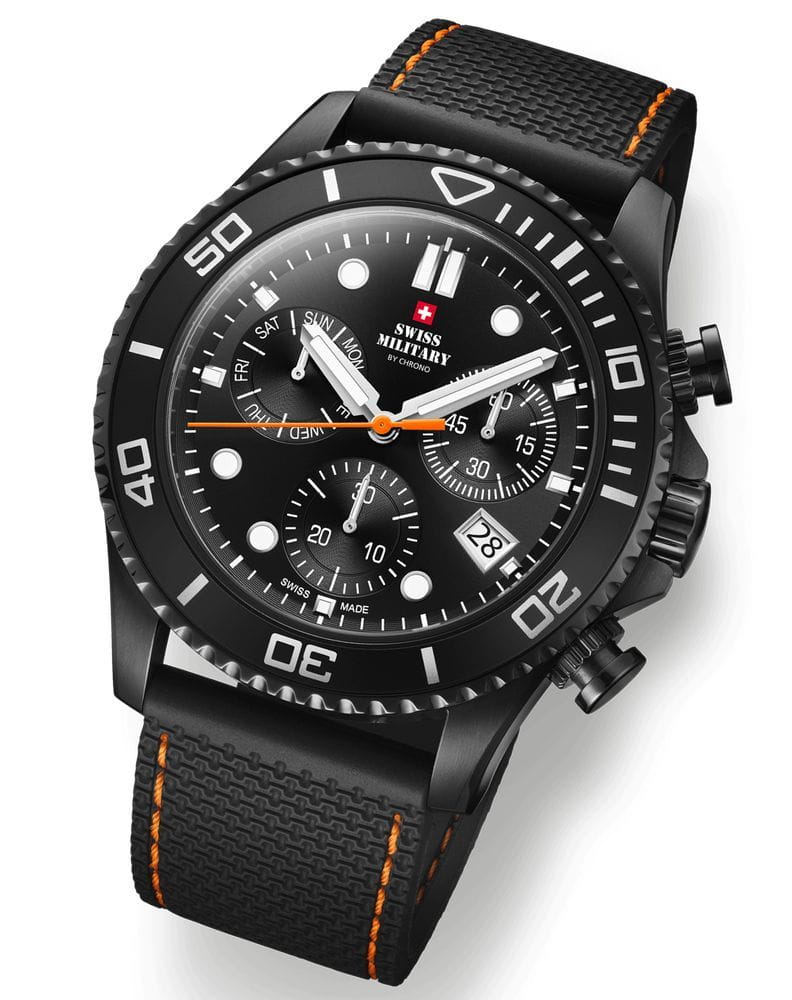 Часы Swiss Military SM34101.08 — это стильный мужской хронограф, который сочетает швейцарское качество и функциональность. Корпус диаметром 46 мм выполнен из нержавеющей стали с чёрным PVD-покрытиемPVDУльтратонкое покрытие наносится в технике вакуумного напыления, сочетает в себе нитрид титана особой прочности со слоем золота или оксида хрома. Несёт в себе декоративную или защитную функцию., что придаёт часам современный и прочный вид. Чёрный циферблат с люминесцентными стрелкамиЛюминесцентное покрытиеПозволяет считывать показания времени в темноте. Производители наносят на стрелки, часовые индексы, безель или поверхность циферблата светонакопительный состав, дающий холодное свечение. и метками обеспечивает превосходную читаемость даже в условиях низкой освещённости. Циферблат защищён сапфировым стекломСапфировое стеклоПрочный и надёжный материал из кристалла сапфира синтетического происхождения, характеризующийся особой твёрдостью и устойчивостью к царапинам и повреждениям., устойчивым к царапинам. Модель оснащена швейцарским кварцевым механизмом, обеспечивающим точное измерение времени. Хронограф позволяет отображать часы, минуты, секунды, а также дату, что добавляет удобства в повседневной жизни. Ремень из высококачественного каучука с оранжевой прострочкой и классической застёжкой обеспечивает комфортное ношение и надёжную фиксацию. Водозащита до 10 ATM делает часы подходящими для плавания и других водных активностей. Swiss Military — это идеальный выбор для мужчин, ценящих стиль, надёжность и функциональность.