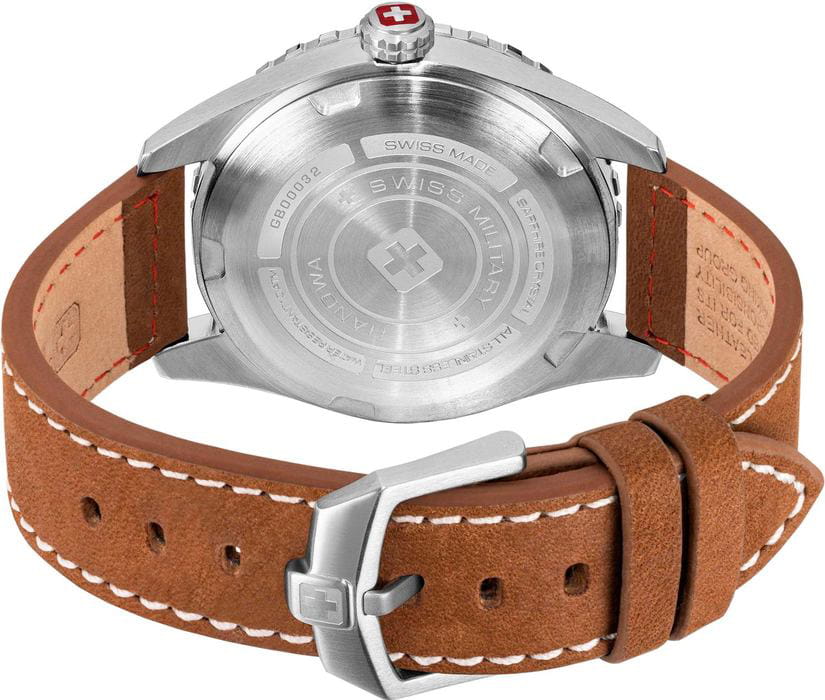 Мужские швейцарские часы с тахиметромТахиметрРазмеченная шкала, располагается на ободке или безеле часов. Тахиметр позволяет рассчитать скорость на определённом участке пути, расстояние измеряется в километрах или милях. Swiss Military Hanowa Afterburn Gmt SMWGB0003202, кварцевый механизм с высокой точностью. Сапфировое стеклоСапфировое стеклоПрочный и надёжный материал из кристалла сапфира синтетического происхождения, характеризующийся особой твёрдостью и устойчивостью к царапинам и повреждениям. устойчивое к появлению царапин, обладающее высокой прозрачностью. Класс водозащиты: 100 метров, позволит плавать, нырять и заниматься другими водными видами спорта. Корпус часов изготовлен из нержавеющей стали. Окошка даты находится в положении трех часов. Стрелки и метки с люминесцентным покрытиемЛюминесцентное покрытиеПозволяет считывать показания времени в темноте. Производители наносят на стрелки, часовые индексы, безель или поверхность циферблата светонакопительный состав, дающий холодное свечение.. Кожаный ремешок.