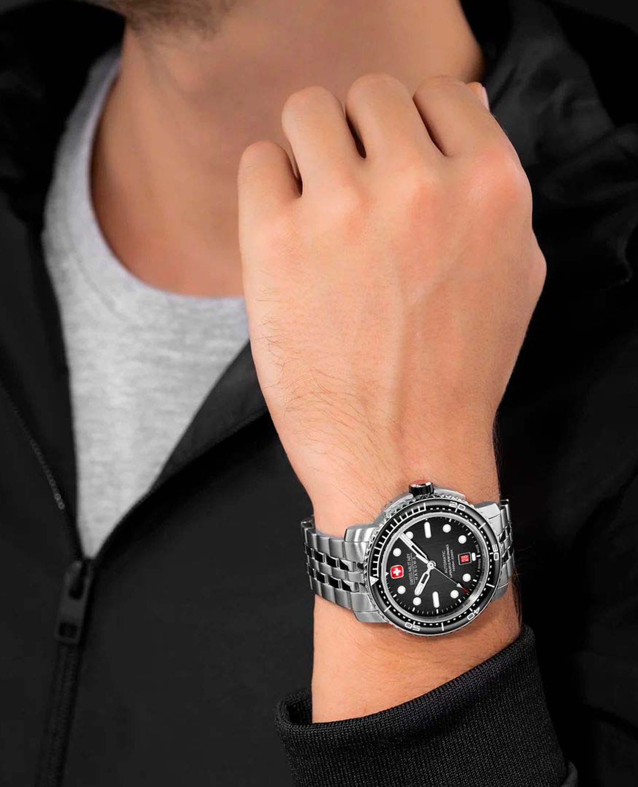 Мужские механические швейцарские часы-хронографХронографФункция позволяет измерять отрезки времени с особой точностью: часы, минуты, секунды. Верным признаком хронографа является наличие на циферблате 3 дополнительных окошек-счётчиков. с автоподзаводом Swiss Military Hanowa Maitre Plongeur SMWGL0002001-SET. Сапфировое стеклоСапфировое стеклоПрочный и надёжный материал из кристалла сапфира синтетического происхождения, характеризующийся особой твёрдостью и устойчивостью к царапинам и повреждениям. устойчивое к появлению царапин, обладающее высокой прозрачностью. Вращающийся безельБезельВнешний ободок, закрепляющий стекло. В спортивных часах так называется поворотное кольцо с делениями на циферблате, выполняет роль таймера – замеряет отрезки времени на шкале. Неподвижный безель – элемент декора. Однонаправленно вращающийся безель на дайверских часах позволяет фиксировать моменты погружения и выныривания на поверхность. из стали с керамической вставкой. Стрелки и метки с люминесцентным покрытиемЛюминесцентное покрытиеПозволяет считывать показания времени в темноте. Производители наносят на стрелки, часовые индексы, безель или поверхность циферблата светонакопительный состав, дающий холодное свечение.. Часы оснащены автоматическим гелиевым клапаном для плавного выравнивания давления при всплытии на поверхность. Окошко даты находится в положении 6 часов. Класс водозащиты: 1000 метров, позволит плавать, нырять и заниматься другими водными видами спорта. Стальной браслет на раскладной застёжкеРаскладная застёжкаТакой тип застёжки используется только на браслетах из металла. Она никогда не раскрывается полностью, происходит разделение на 2 и более частей. Раскладывающая застёжка снизит вероятность потери часов к минимуму.. В комплекте силиконовый ремешок с классический застежкой.