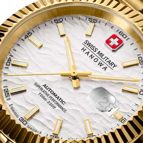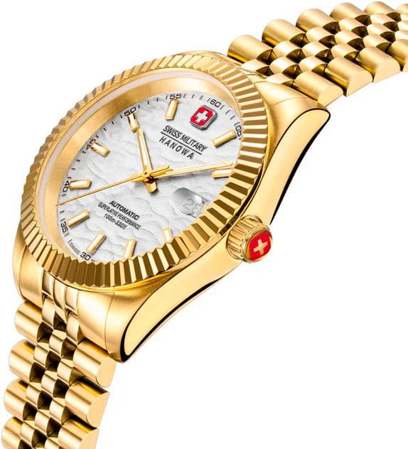 Часы Swiss Military Hanowa Master Diligenter SMWGL0005410 — это образец швейцарской точности и изысканного стиля. Эти механические часы с автоподзаводом оснащены калибром Soprod P024, который обеспечивает надежную работу механизма. Запас хода составляет 38 часов, что гарантирует их бесперебойное функционирование. Элегантный корпус диаметром 41 мм и толщиной 11 мм выполнен из прочной стали с золотистым IP-покрытиемIP-покрытиеМетод ионного напыления. Демонстрирует повышенную устойчивость к истиранию, окислению и химическим веществам. Под воздействием высокого давления и температуры около 1500°C молекулы металла надёжно соединяются с частицами корпуса часов. и украшен рифленым безелемБезельВнешний ободок, закрепляющий стекло. В спортивных часах так называется поворотное кольцо с делениями на циферблате, выполняет роль таймера – замеряет отрезки времени на шкале. Неподвижный безель – элемент декора. Однонаправленно вращающийся безель на дайверских часах позволяет фиксировать моменты погружения и выныривания на поверхность.. Серебристый текстурированный циферблат защищен сапфировым стекломСапфировое стеклоПрочный и надёжный материал из кристалла сапфира синтетического происхождения, характеризующийся особой твёрдостью и устойчивостью к царапинам и повреждениям., которое устойчиво к царапинам и сохраняет безупречный вид. Метки в виде штрихов и стрелки имеют люминесцентное покрытиеЛюминесцентное покрытиеПозволяет считывать показания времени в темноте. Производители наносят на стрелки, часовые индексы, безель или поверхность циферблата светонакопительный состав, дающий холодное свечение., которое обеспечивает видимость в темноте после кратковременной зарядки на свету. Окошко даты с увеличительным стеклом расположено в положении 3 часа, а фирменный логотип Swiss Military Hanowa находится в позиции 12 часов. Заводная головка с рифлением украшена фирменным логотипом, добавляя часам изысканный акцент. Прозрачная задняя крышка позволяет наблюдать за работой механизма, подчеркивая внимание к деталям. Завершает образ стальной браслет с золотистым IP-покрытиемIP-покрытиеМетод ионного напыления. Демонстрирует повышенную устойчивость к истиранию, окислению и химическим веществам. Под воздействием высокого давления и температуры около 1500°C молекулы металла надёжно соединяются с частицами корпуса часов. и раскладной застёжкойРаскладная застёжкаТакой тип застёжки используется только на браслетах из металла. Она никогда не раскрывается полностью, происходит разделение на 2 и более частей. Раскладывающая застёжка снизит вероятность потери часов к минимуму., который удобно сидит на запястье и обеспечивает надежную фиксацию. Часы обладают водозащитой уровня 100WR, что делает их подходящими для повседневного использования и активного образа жизни.