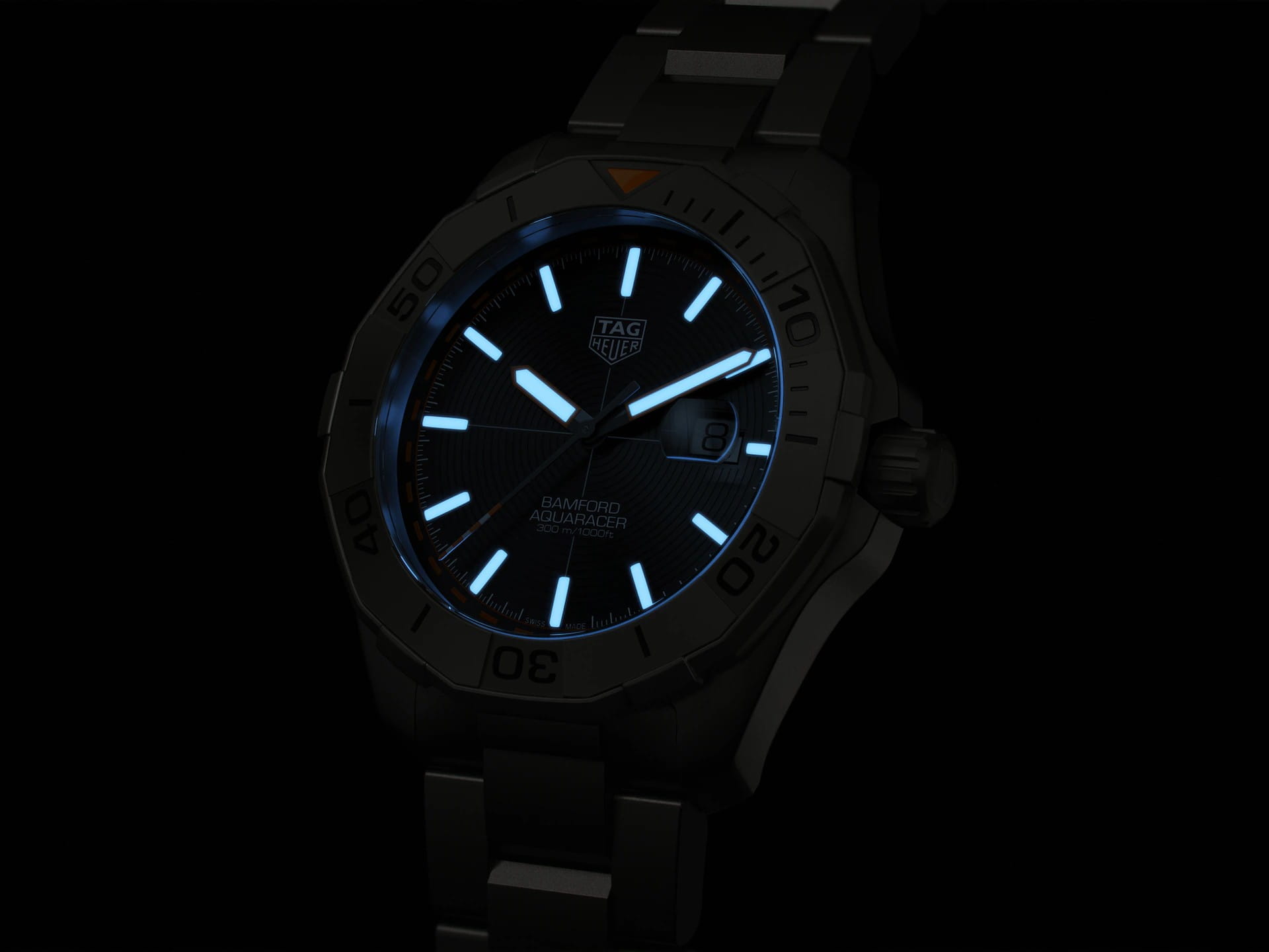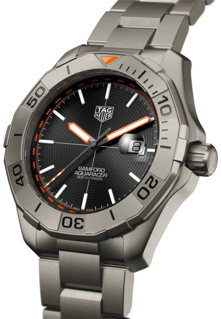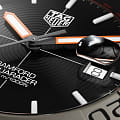 Лимитированная серия Aquaracer с черным циферблатом разработана совместно с Bamford Watch Department. Корпус диаметром 43 мм отличается сверхлегким весом, а вращающийся в одном направлении безель и трехрядный браслет со шкалой 60 минут изготовлены из сверхпрочного титана (степень 2). Швейцарские мужские часы TAG Heuer Carrera WAY208F.BF0638, механический механизм (автоматический калибр) с высокой точностью. Сапфировое стекло устойчивое к появлению царапин, обладающее высокой прозрачностью. Класс водозащиты: 300 метров, позволит плавать, нырять и заниматься другими водными видами спорта. Корпус часов изготовлен из титана, серебристого цвета.
