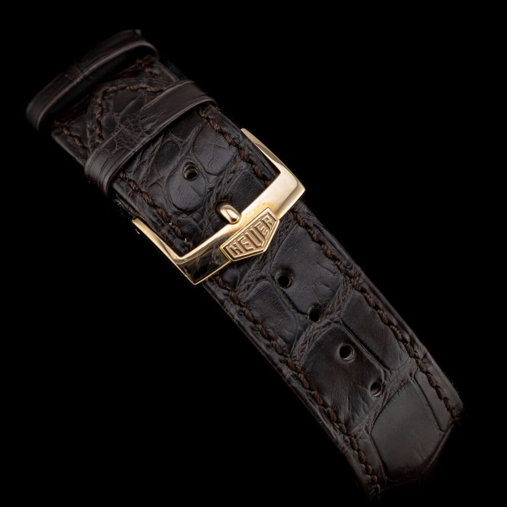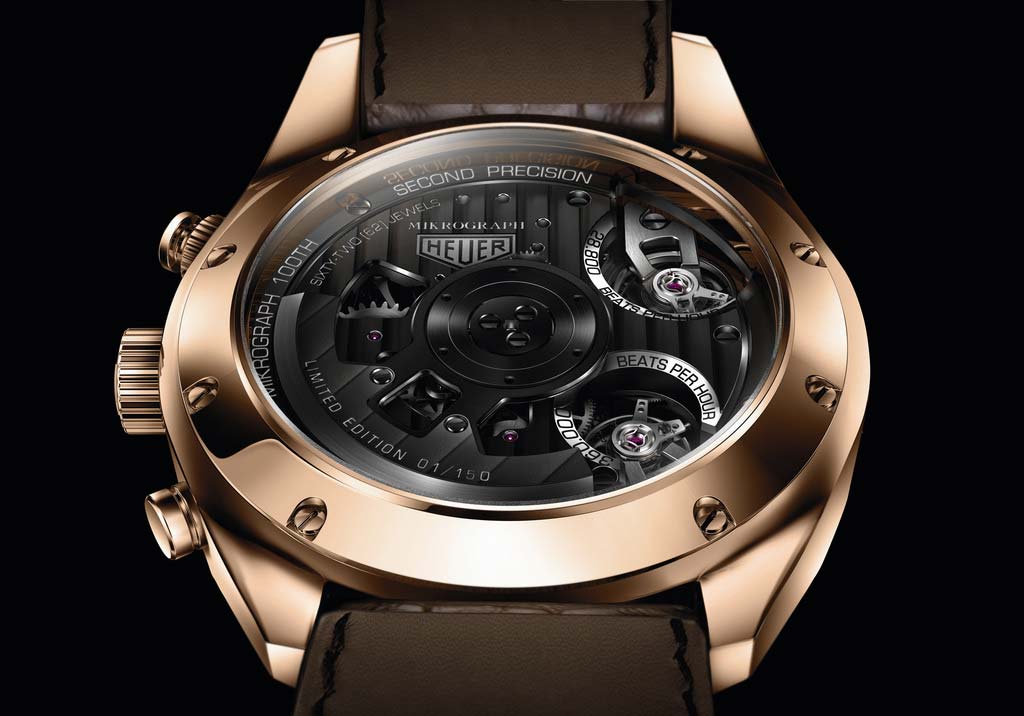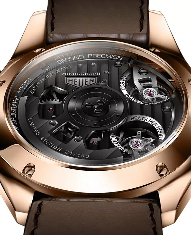 Механические мужские швейцарские часы-хронографХронографФункция позволяет измерять отрезки времени с особой точностью: часы, минуты, секунды. Верным признаком хронографа является наличие на циферблате 3 дополнительных окошек-счётчиков. TAG Heuer Carrera CAR5040.FC8177. Уникальная модель в винтажном стиле объединила в себе дизайн с секундомераСекундомерСекундоме́р — прибор, способный измерять интервалы времени с точностью до долей секунды. Mikrograph 1916 года и легендарный дизайн TAG Heuer Carrera, представляя миру сочетание традиционности и новшества. Carrera Mikrograph 1/100 of a Second. Лимитированная серия - 150 экземпляров. Уникальность данной модели состоит в том, что в ней соединили два балансовых колеса с раздельными системами спуска и трансмиссии. Одно из колес работает с частотой 28 800 и отвечает за показания времени и даты, запас хода 42 часа, а другое – с частотой 360 000 полуколебаний в час отвечает за показания хронографа. Шкала от 0 до 100 по окружности циферблата - это индикатор запаса хода для него. В механизме 62 камня. 396 деталей. Хронометр сертифицирован сертификат COSCСертификат COSCОфициальный сертификат, подтверждающий то, что часы ходят с особо высокой точностью. Для получения документа часы подвергаются тестовым испытаниям, разработанным швейцарским институтом тестирования хронометров COSC. Допустимая норма для механических часов -4/+6 секунд в день, для кварцевых моделей +/- 0,07 секунд в день.. Прозрачная задняя крышка. Циферблат с люминесцентным покрытиемЛюминесцентное покрытиеПозволяет считывать показания времени в темноте. Производители наносят на стрелки, часовые индексы, безель или поверхность циферблата светонакопительный состав, дающий холодное свечение. стрелок.