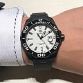 TAG Heuer Aquaracer WAY108A.FT6141 — элегантные мужские часы, сочетающие современный дизайн и высокую функциональность. Корпус диаметром 43 мм выполнен из титана с PVD-покрытиемPVDУльтратонкое покрытие наносится в технике вакуумного напыления, сочетает в себе нитрид титана особой прочности со слоем золота или оксида хрома. Несёт в себе декоративную или защитную функцию. чёрного цвета, обеспечивающим лёгкость и прочность. Белый циферблат с часовыми метками и стрелками, покрытыми люминесцентным покрытиемЛюминесцентное покрытиеПозволяет считывать показания времени в темноте. Производители наносят на стрелки, часовые индексы, безель или поверхность циферблата светонакопительный состав, дающий холодное свечение., гарантирует отличную читаемость в любых условиях освещения. Часы оснащены точным кварцевым механизмом, обеспечивающим стабильное отображение времени. Функциональность включает индикацию часов, минут, секунд и даты, расположенной на отметке «3 часа». Сапфировое стеклоСапфировое стеклоПрочный и надёжный материал из кристалла сапфира синтетического происхождения, характеризующийся особой твёрдостью и устойчивостью к царапинам и повреждениям. обеспечивает надёжную защиту от царапин и превосходную читаемость. Чёрный каучуковый ремешок оснащён раскладной застёжкойРаскладная застёжкаТакой тип застёжки используется только на браслетах из металла. Она никогда не раскрывается полностью, происходит разделение на 2 и более частей. Раскладывающая застёжка снизит вероятность потери часов к минимуму. из титана с PVD-покрытиемPVDУльтратонкое покрытие наносится в технике вакуумного напыления, сочетает в себе нитрид титана особой прочности со слоем золота или оксида хрома. Несёт в себе декоративную или защитную функцию. и двойными предохранительными кнопками. Водозащита до 300 метров (30 бар) делает модель идеальной для дайвинга и активного образа жизни.