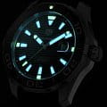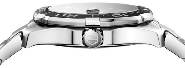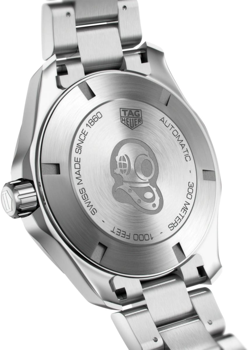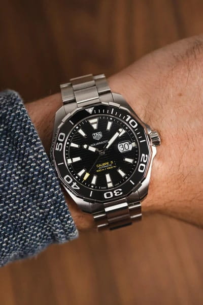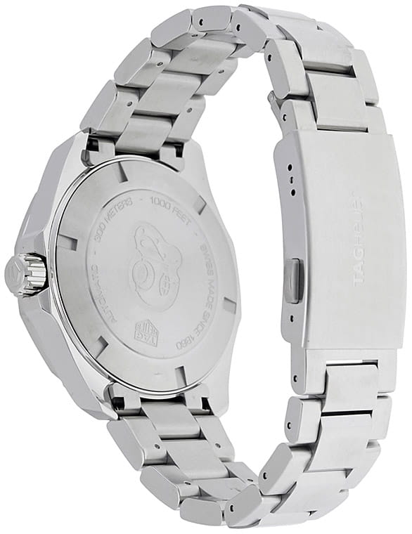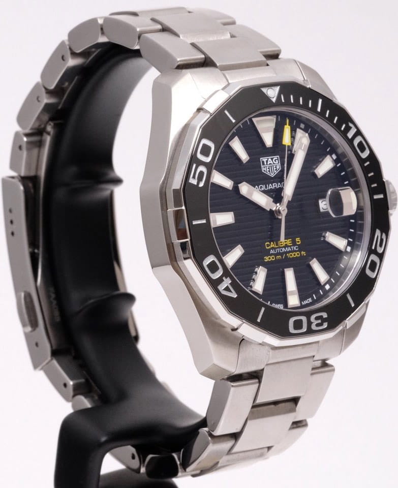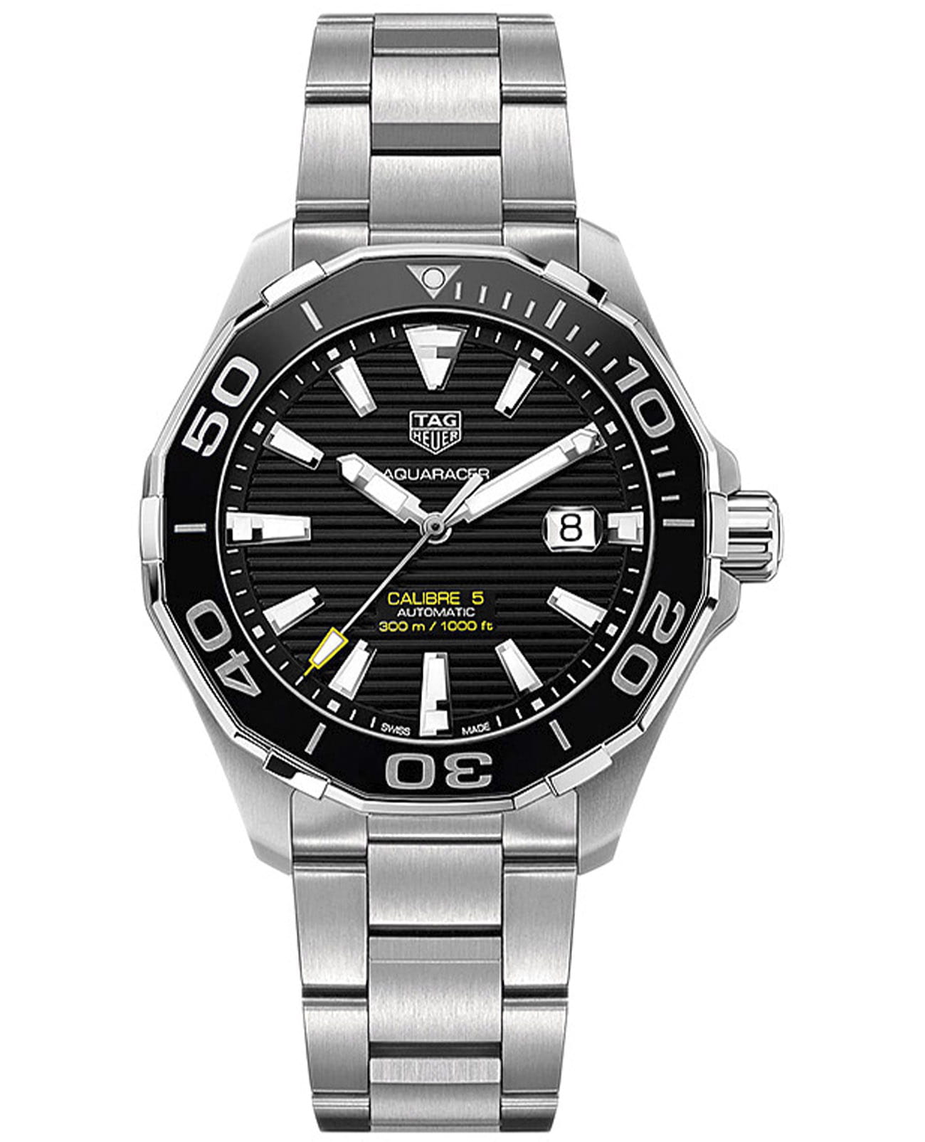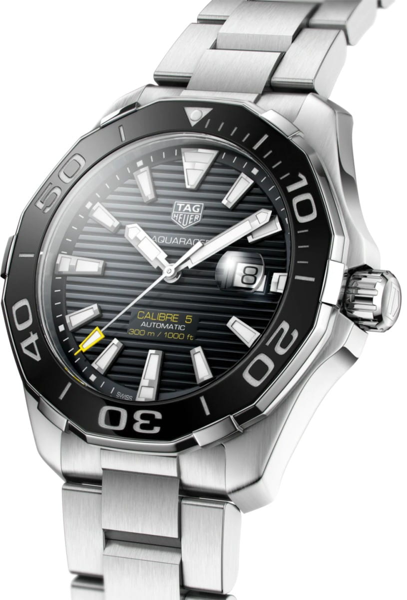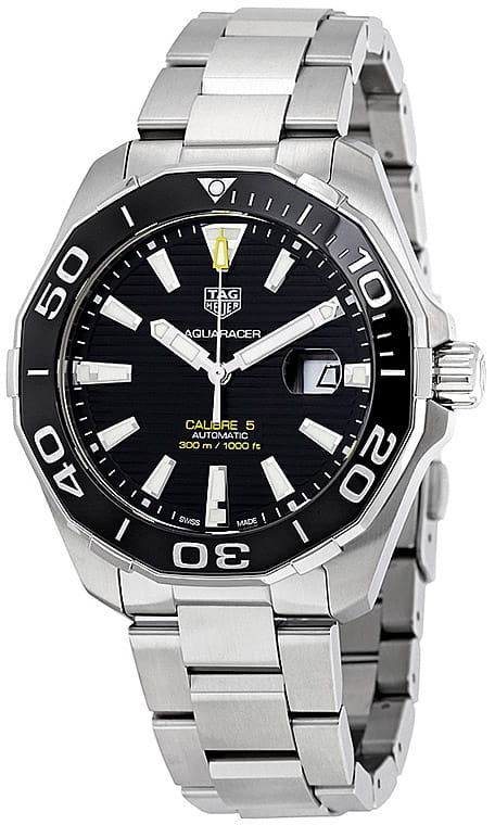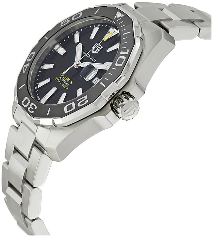 Автоматические мужские часы TAG Heuer Aquaracer Calibre 5 Automatic WAY201A.BA0927, механический механизм (автоматический калибр) с высокой точностью. Сапфировое стеклоСапфировое стеклоПрочный и надёжный материал из кристалла сапфира синтетического происхождения, характеризующийся особой твёрдостью и устойчивостью к царапинам и повреждениям. устойчивое к появлению царапин, обладающее высокой прозрачностью. Класс водозащиты: 300 метров, позволит плавать, нырять и заниматься другими водными видами спорта. Корпус часов изготовлен из стали. Стальной браслет на раскладной застёжкеРаскладная застёжкаТакой тип застёжки используется только на браслетах из металла. Она никогда не раскрывается полностью, происходит разделение на 2 и более частей. Раскладывающая застёжка снизит вероятность потери часов к минимуму.. В механизме 25 или 26 камней в зависимости от исполнения, частота 28800 полуколебаний в час. Запас хода 38 часов. Окошко даты с увеличительным стеклом. Керамический безельБезельВнешний ободок, закрепляющий стекло. В спортивных часах так называется поворотное кольцо с делениями на циферблате, выполняет роль таймера – замеряет отрезки времени на шкале. Неподвижный безель – элемент декора. Однонаправленно вращающийся безель на дайверских часах позволяет фиксировать моменты погружения и выныривания на поверхность. вращается в одном направлении. Завинчивающаяся заводная головка с защитой. Завинчивающаяся задняя крышка. Накладные полированные граненые индексы с родиевым покрытием. Стрелки и метки с люминесцентным покрытиемЛюминесцентное покрытиеПозволяет считывать показания времени в темноте. Производители наносят на стрелки, часовые индексы, безель или поверхность циферблата светонакопительный состав, дающий холодное свечение..