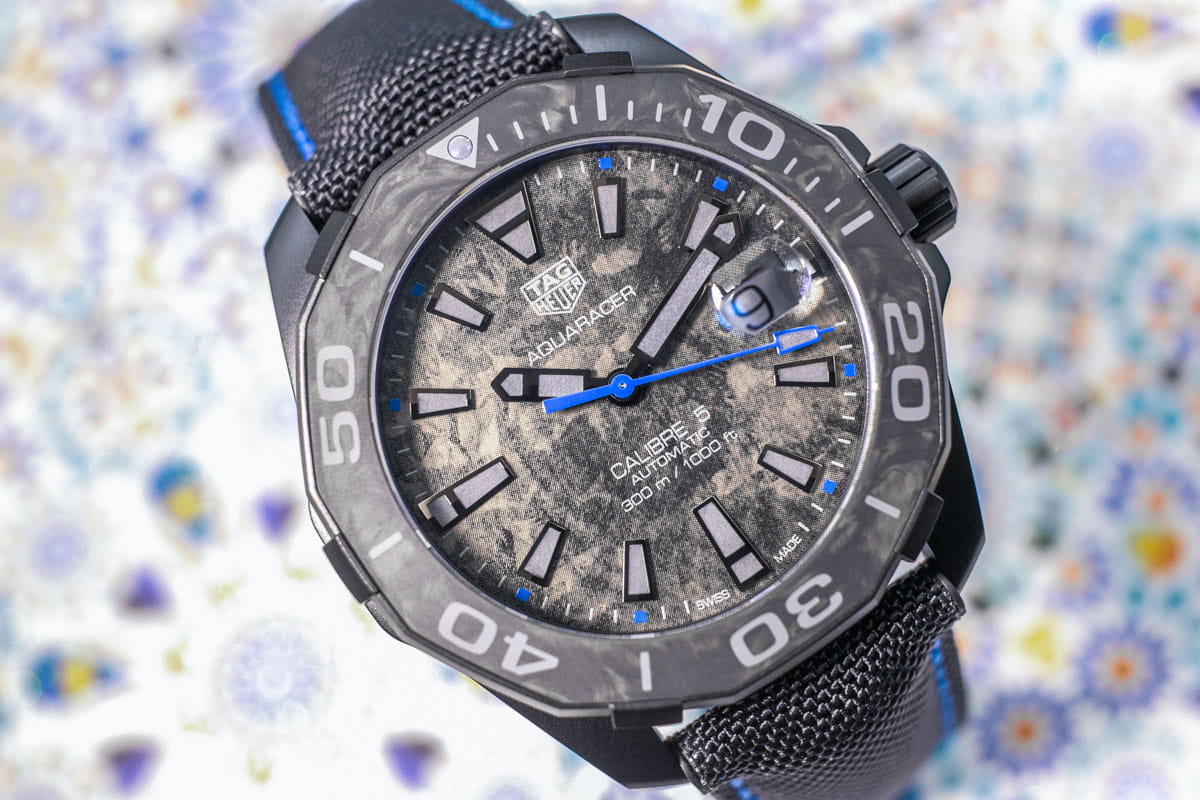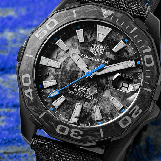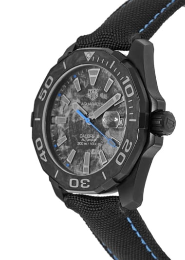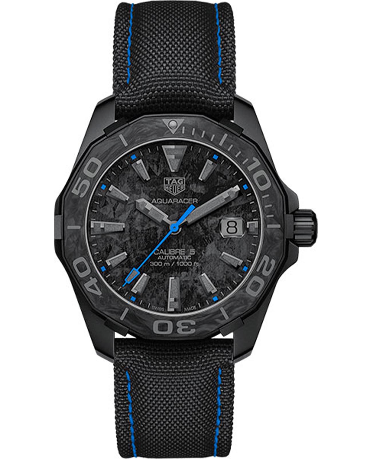 Эти точнейшие швейцарские часы Tag Heuer Aquaracer WBD218C.FC6447 с карбоновыми вставками станут одним из главных аксессуаров в арсенале дайвера. В точнейшем швейцарском механизме 25 или 26 камней в зависимости от исполнения, частота 28800 полуколебаний в час. Запас хода 38 часов. Окошко даты с увеличительным стеклом. Карбоновый циферблат защищен прочным Сапфировое стеклоСапфировое стеклоПрочный и надёжный материал из кристалла сапфира синтетического происхождения, характеризующийся особой твёрдостью и устойчивостью к царапинам и повреждениям. с антибликовым покрытием. Карбоновый безель вращается в одном направлении. Завинчивающаяся заводная головка с защитой. Титановая задняя крышка с выгравированным изображением водолазного шлема. Люминесцентное покрытиеЛюминесцентное покрытиеПозволяет считывать показания времени в темноте. Производители наносят на стрелки, часовые индексы, безель или поверхность циферблата светонакопительный состав, дающий холодное свечение.. Браслет из нейлона с раскладывающейся застежкой и системой увеличения длины.